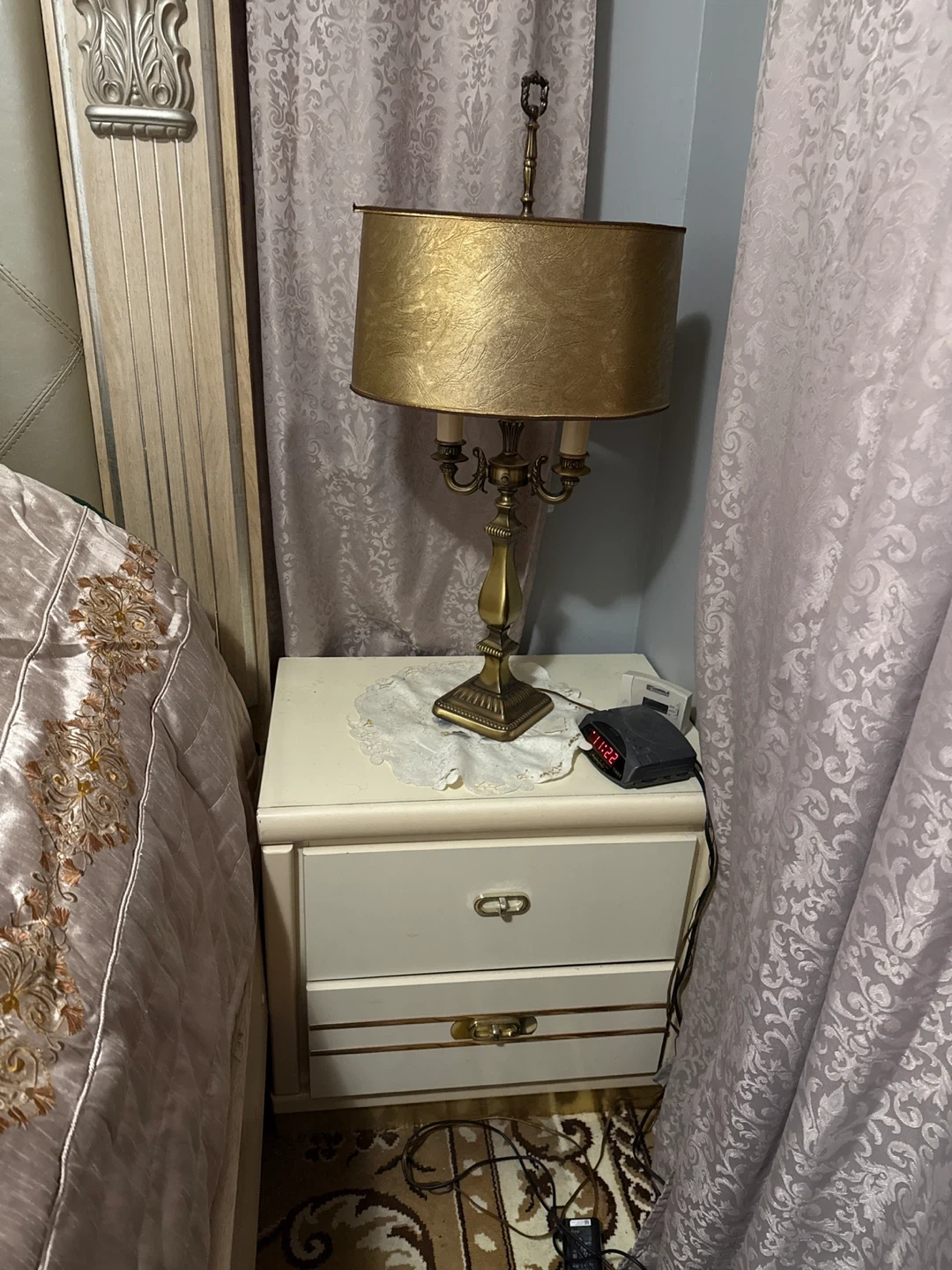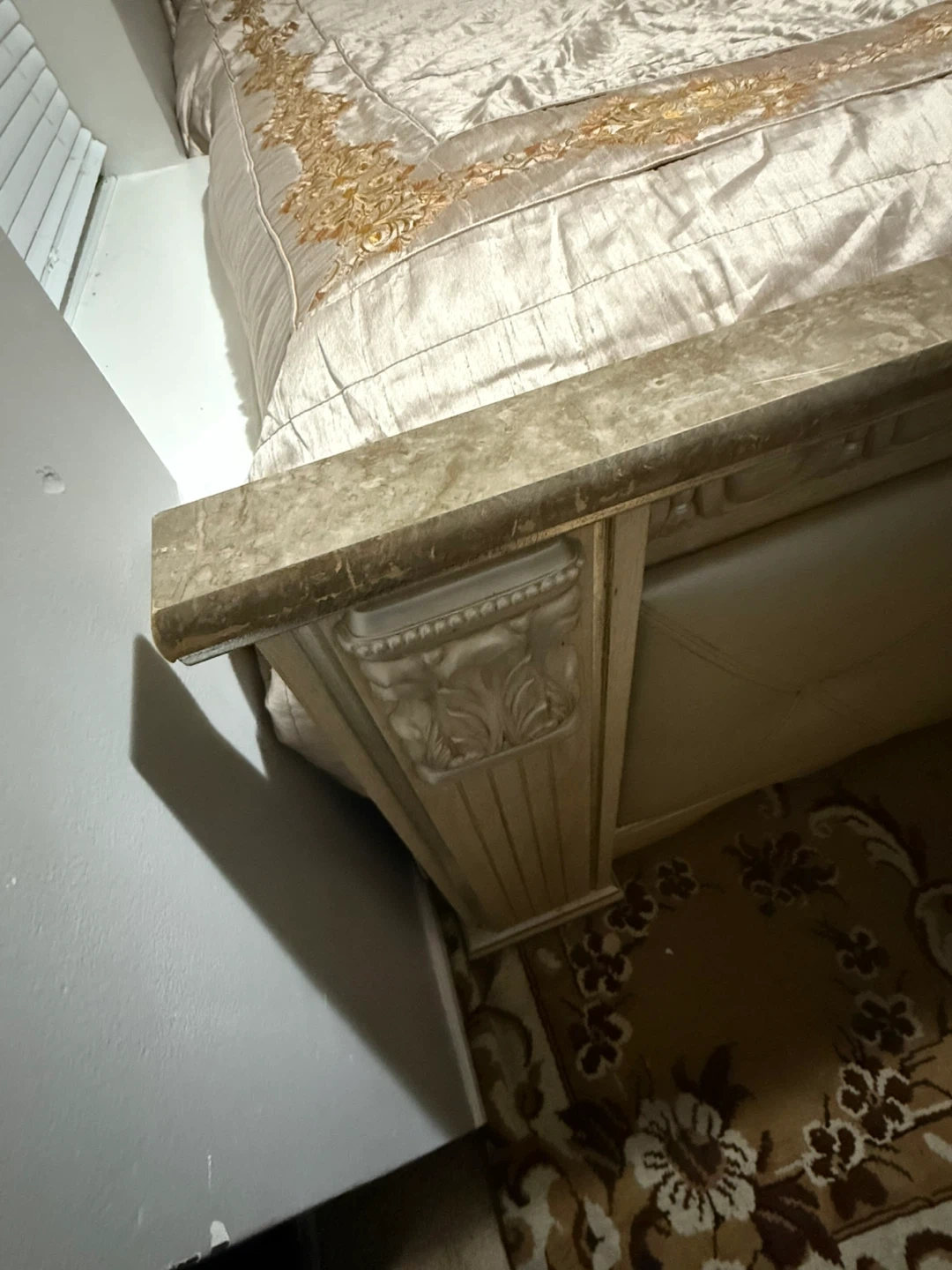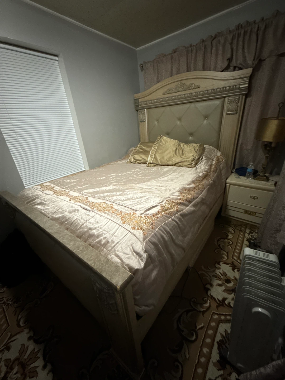 Selling a queen size bed frame with an elegant design it comes with night stand and table lamp as you see it at pictures. It's in great condition and ready to be a beautiful addition to your bedroom. The frame features detailed carvings and a neutral color palette, making it easy to match with various decor styles. With real leather accents.Feel free to reach out if you're interested!