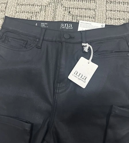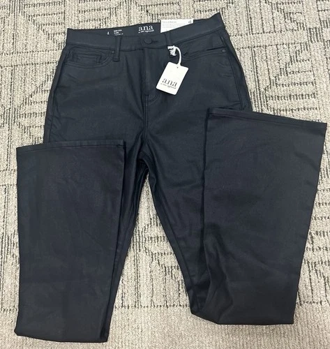 The product is a pair of a.n.a. A New Approach jeans in a size 4 tall for women. These high-rise, flared leg jeans are made from a cotton blend denim fabric in a sleek black color. The jeans feature a zip closure, pockets, and have an inseam of 32 inches. Perfect for all seasons, these stylish jeans offer a comfortable and flattering fit for tall women looking for a versatile and trendy denim option.