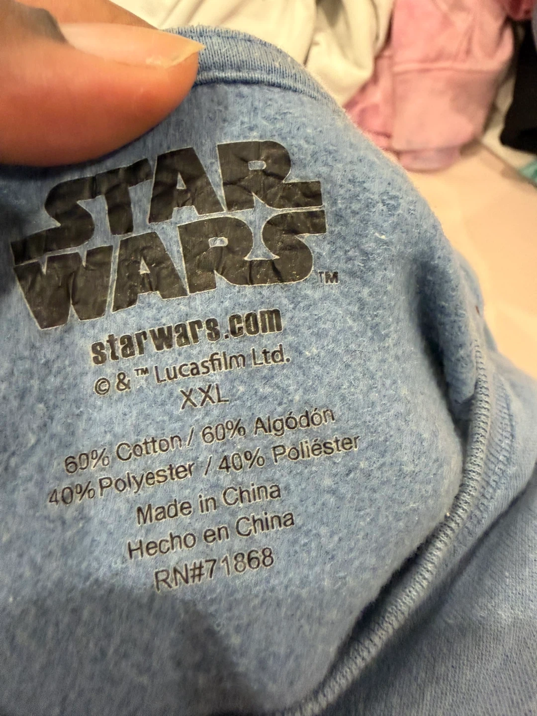 Selling a Star Wars sweatshirt in size XXL! It's light blue and features a cute graphic with Grogu. The material is a blend of 60% cotton and 40% polyester, making it comfy to wear