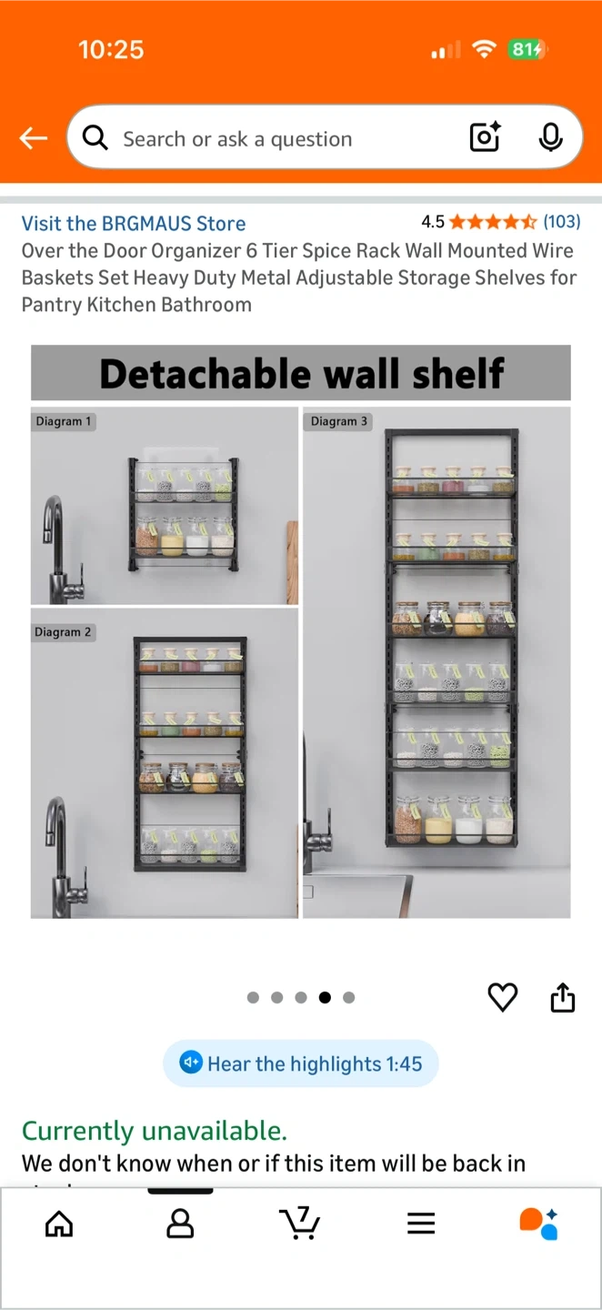 Selling a BRGMAUS over-the-door 6-tier spice rack! It's a wall-mounted wire basket set, perfect for adding heavy-duty metal adjustable storage shelves to your pantry, kitchen, or bathroom. The dimensions are approximately 50.2 inches in height, 16.7 inches in width, and 6.1 inches in depth. (Top shelf alcohol not included!!)