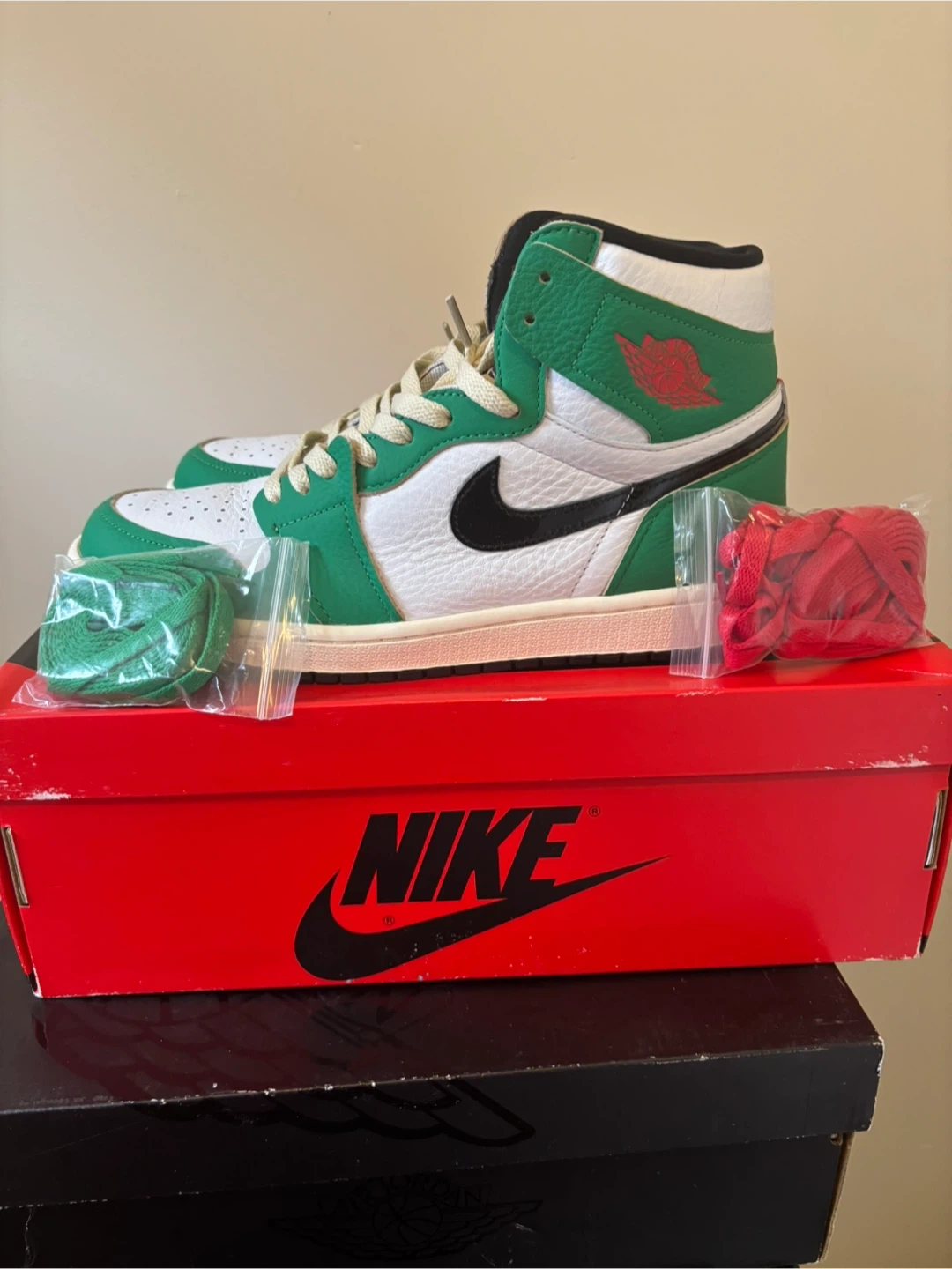 Selling a pair of Nike Air Jordan 1 Retro High in the Lucky Green colorway! Comes with the original box, and includes extra laces in both green and red. These are a stylish addition to any sneaker collection!