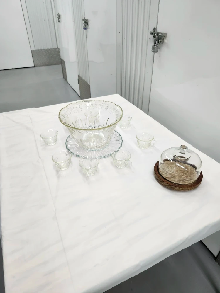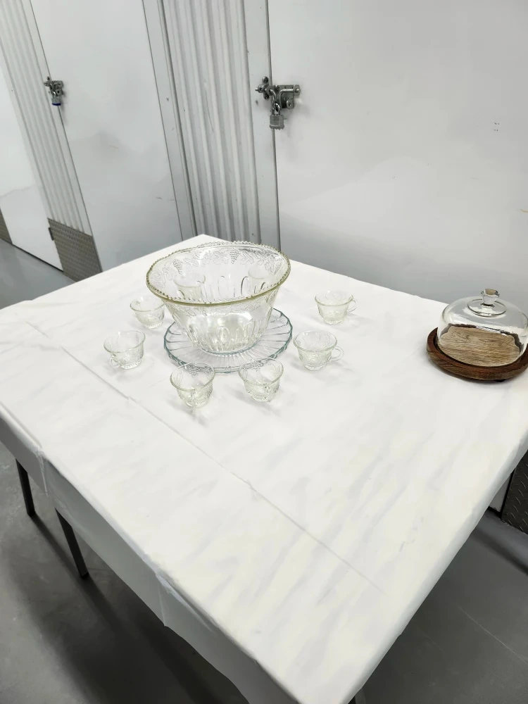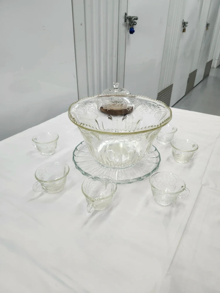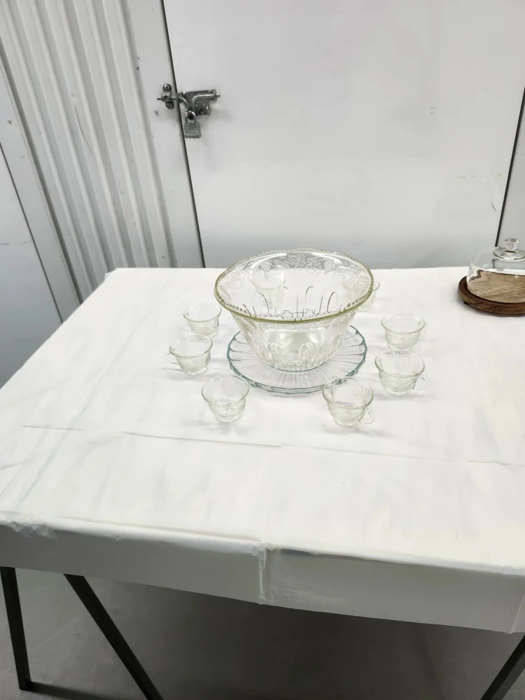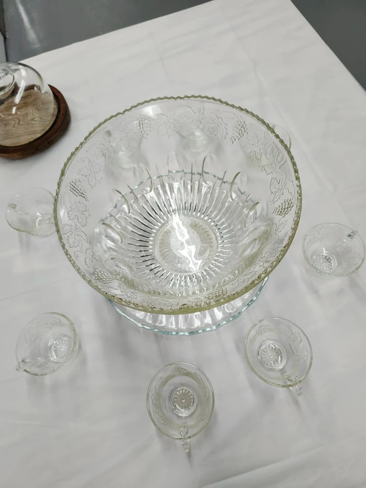 Clear glass punch bowl set with etched grape and leaf design. Like crystal. Ready for Thanksgiving or Christmas or parties. Includes large bowl and 8 cups and plate. No hooks. No ladle. In great condition. Get this quick. $50 bucks....