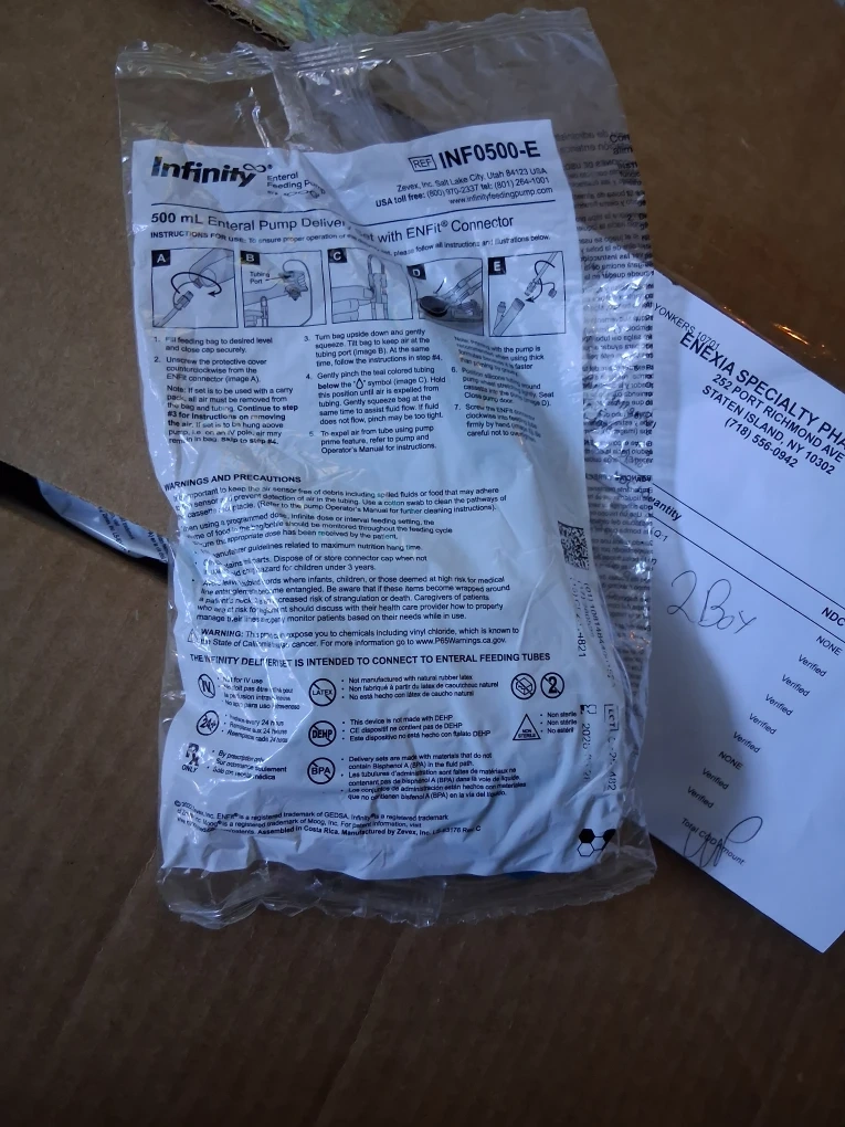 I'm selling 85 count of Infinity 500 mL Enteral Pump Delivery Sets with ENFit Connector! They're designed for enteral feeding tubes. Please note the expiration date is November 2025.