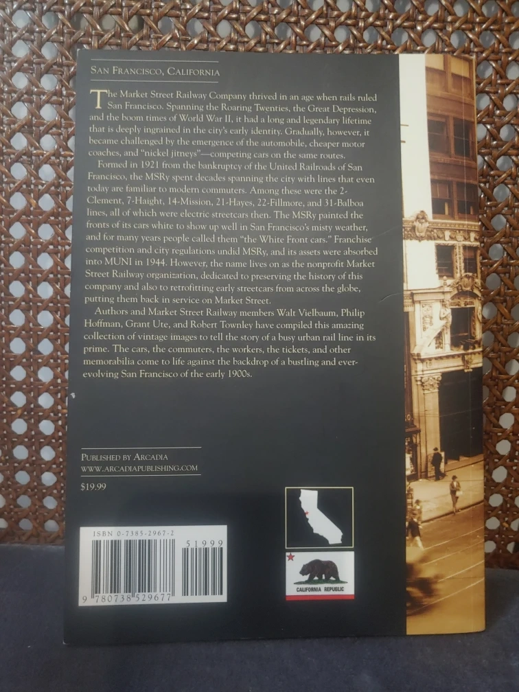 Selling a copy of "San Francisco's Market Street Railway" from the Images of Rail series by Walt Vielbaum, Philip Hoffman, Grant Ute, and Robert Townley. This book dives into the history of the Market Street Railway Company in San Francisco, from its beginnings in 1921 through its absorption into MUNI in 1944. Published by Arcadia Publishing.
