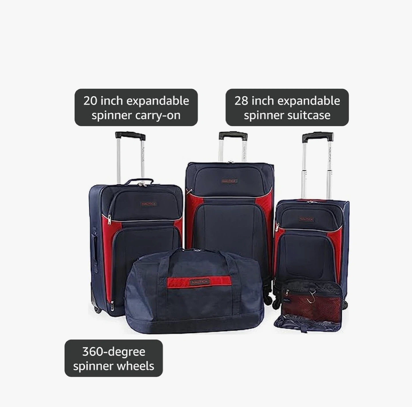Get ready to travel with this Nautica luggage set! It includes a 20-inch expandable spinner carry-on, a 28-inch expandable spinner suitcase, and a duffel bag. All pieces feature 360-degree spinner wheels for easy maneuvering