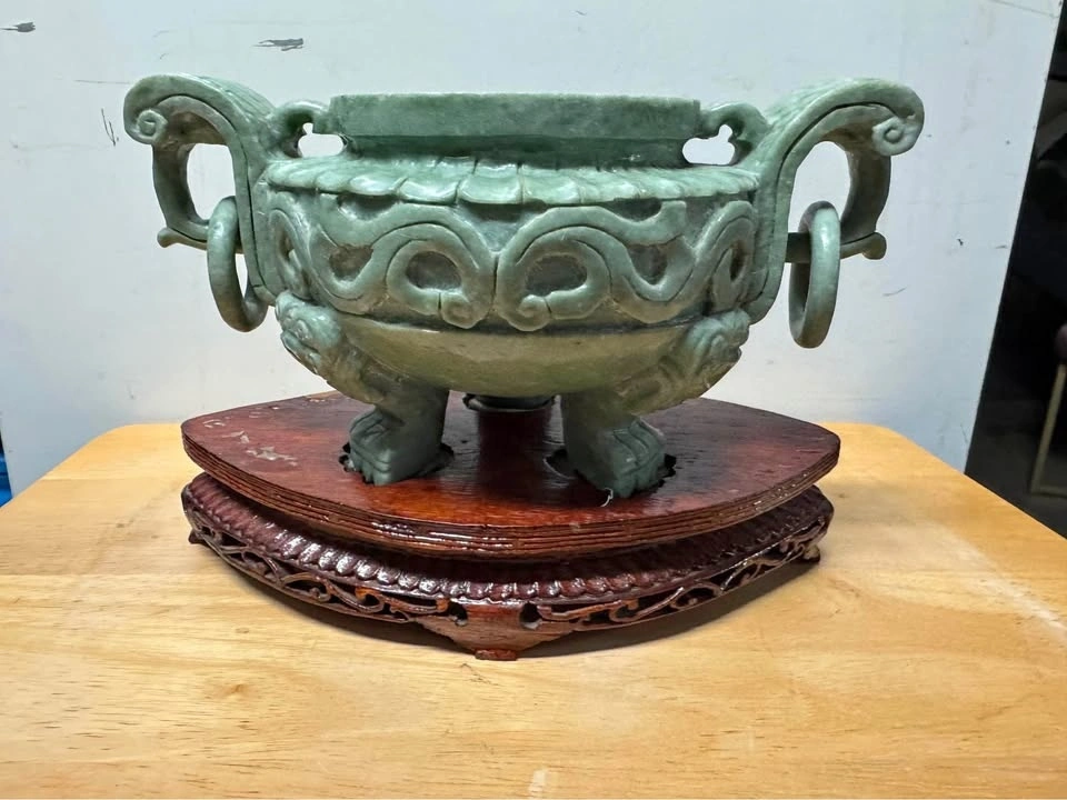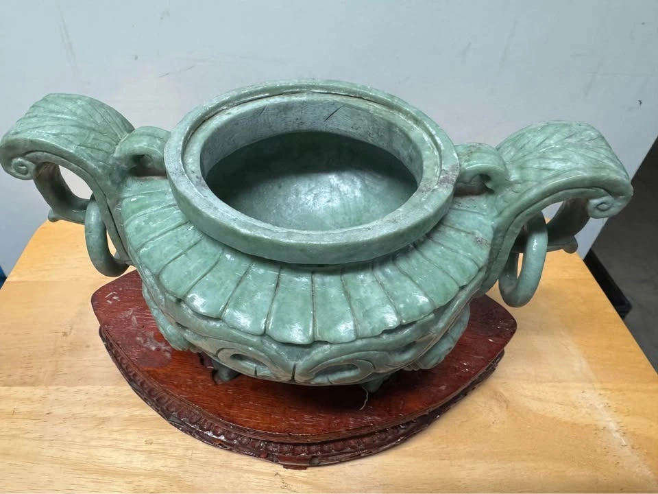 Beautiful carved jade-style Chinese censer/incense burner with tripod legs, ring handles, and traditional taotie mask detailing. Solid stone, good weight, and comes with a carved wooden display stand.