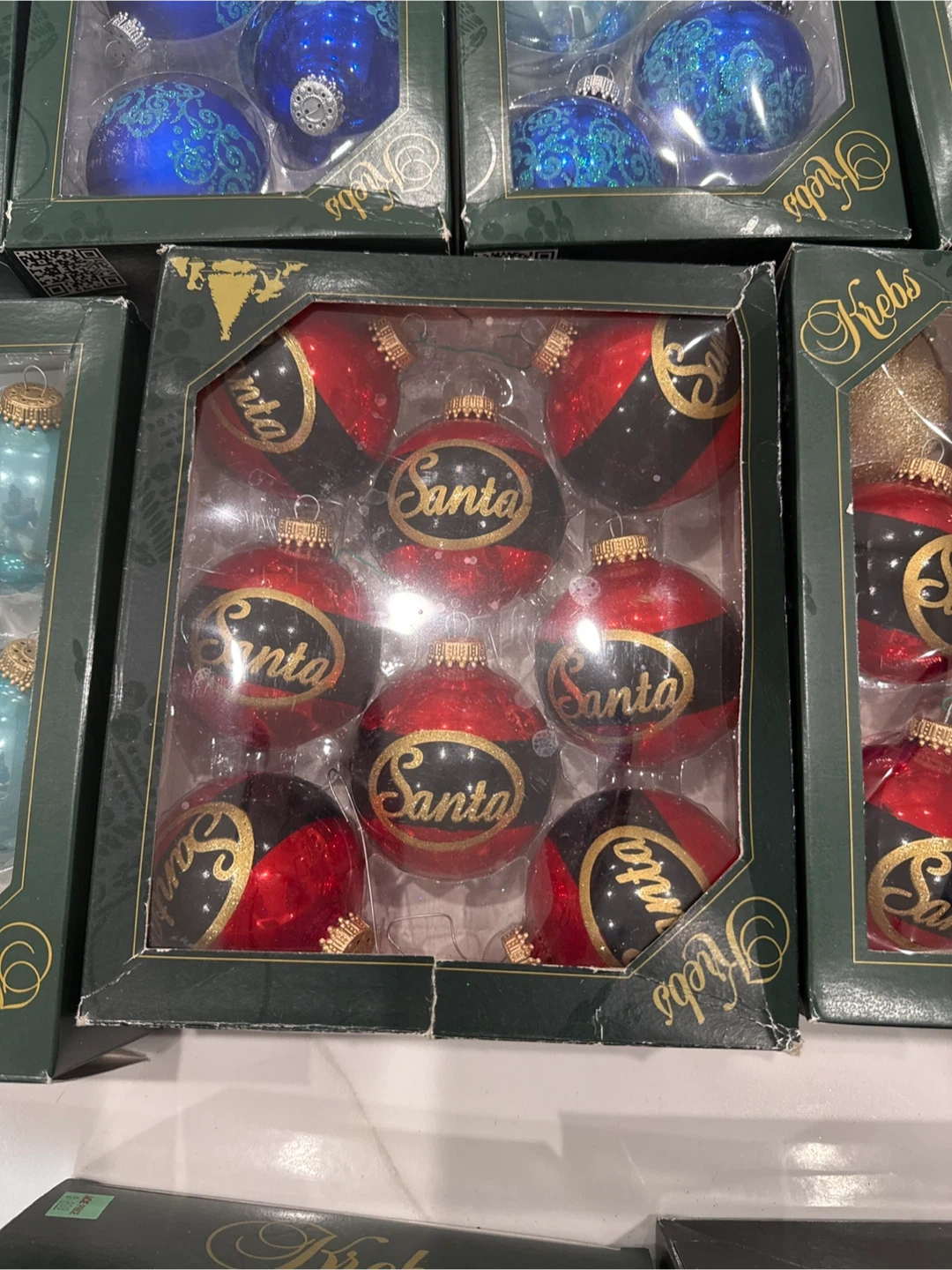 Here's a set of Krebs Christmas ornaments! These are red and black with the word 'Santa' written in gold. They come in the original box, ready to add some festive cheer to your holiday decor