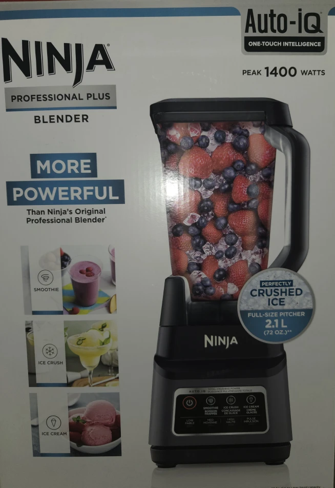 Selling a Ninja Professional Plus Blender in excellent condition! It features Auto-iQ one-touch intelligence and a powerful 1400 watt motor, perfect for smoothies, ice crushing, and even ice cream. The full-size pitcher holds 2.1L (72 oz). Get ready to blend like a pro! Unopened packaging.