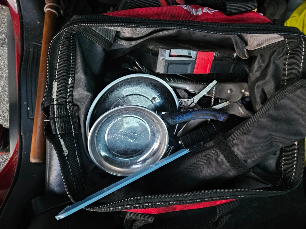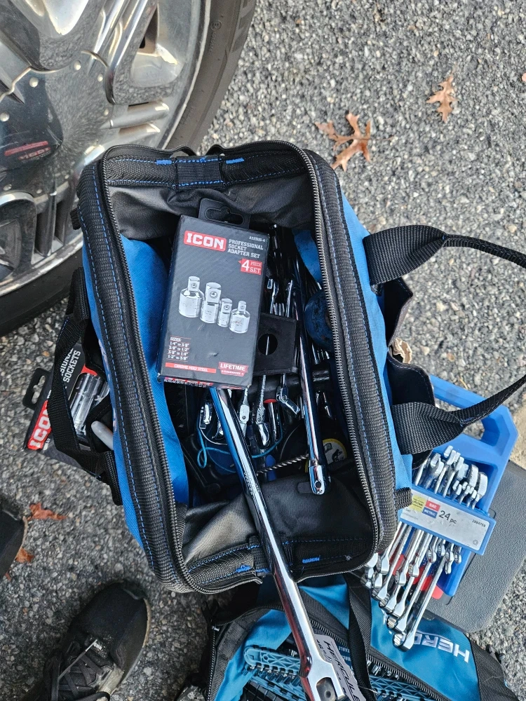 3 tool bags filled with 1/4 ,3/8, 1/2 Kobalt Sockets and Drivers along with a 24 and 28-piece wrench set also Craftsman sockets, Craftsman hammer and picks, magnet trays, husky pliers and vice grips, scrapers screw drivers and many more tools. There is over $160 worth of tools in all 3 bags.