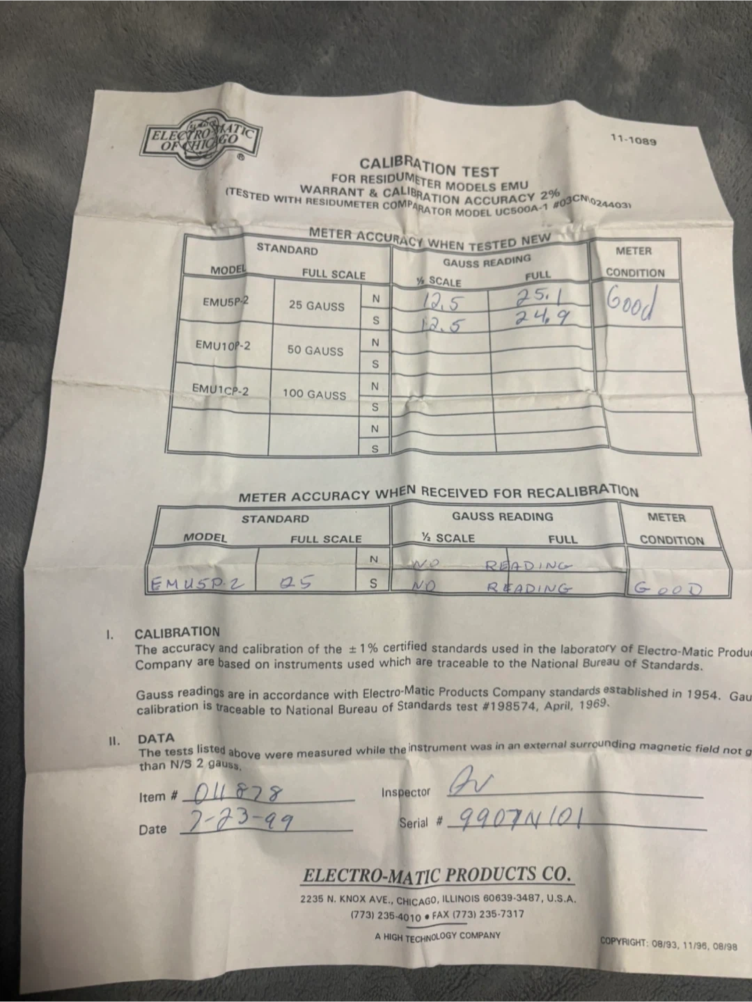 Selling an Electro-Matic Products Co. Model EMU5 Residometer. It's a magnetic field (gauss) indicator. Comes with the original box and calibration data sheet. A unique piece for your collection or lab. It is used but in good condition. We tried it out and it does work still.