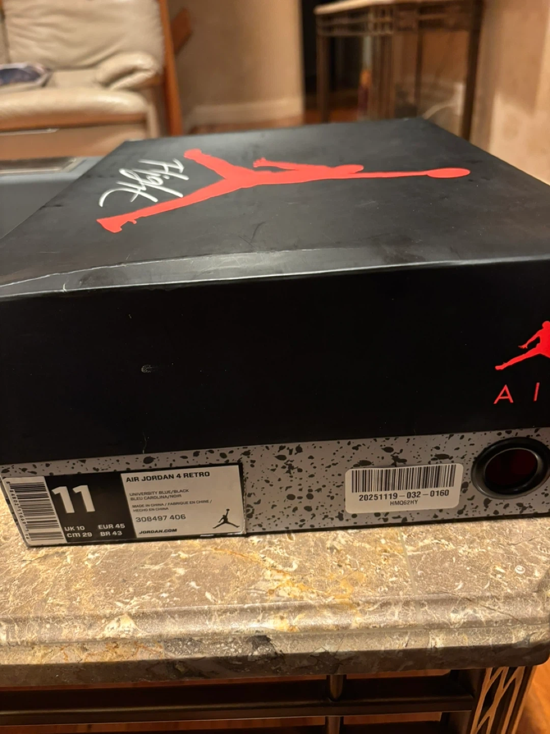 Selling a pair of Air Jordan 4 Retro in the University Blue BASKETBALL , size 11. They come with the original box. The manufacturing date is 2025 November 19. (Bought wrong size). Men’s FREE SHIPPING