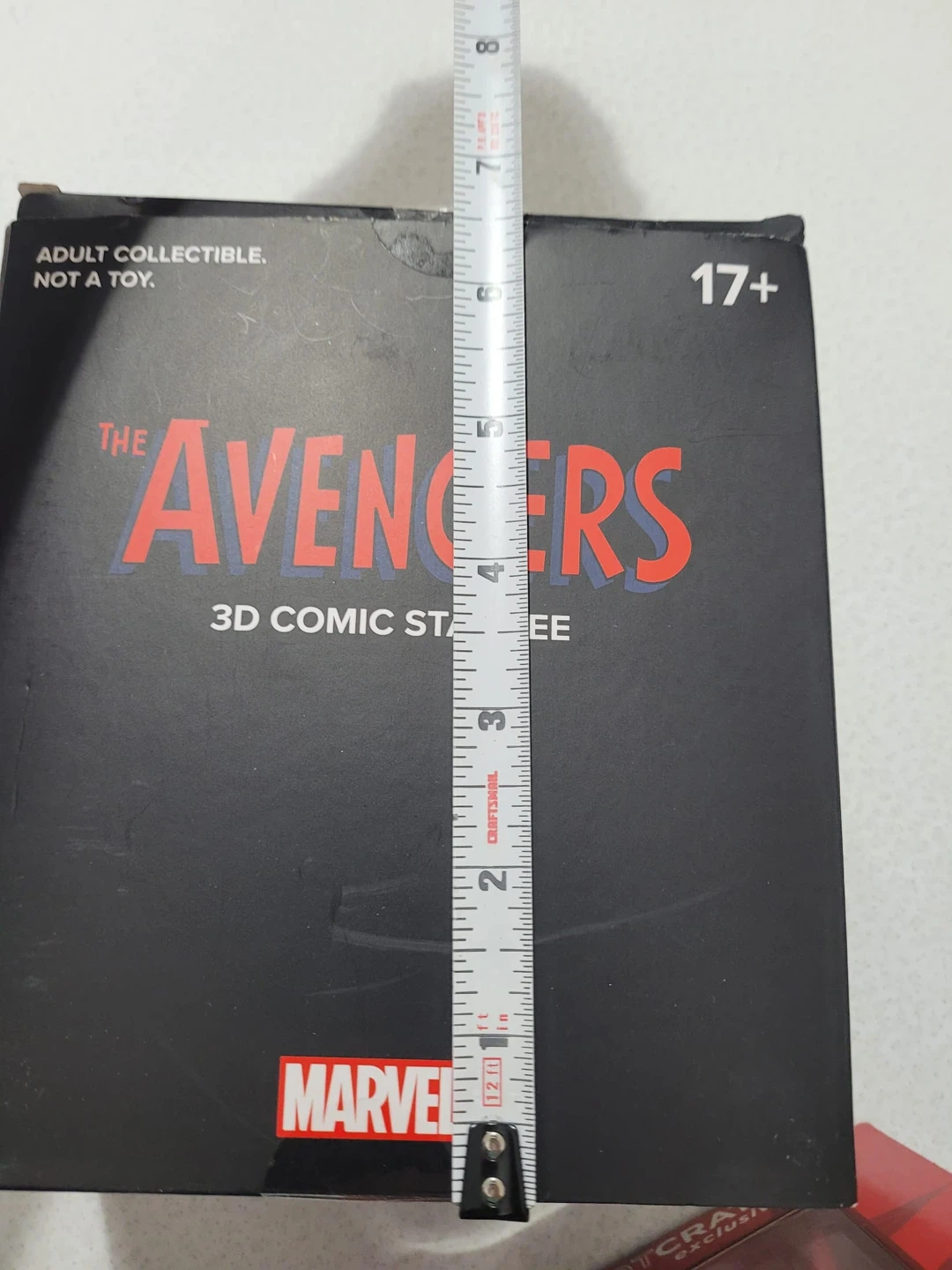 Selling a Marvel The Avengers 3D Comic Standee. It is an adult collectible and not a toy. It is recommended for ages 17 and up. The box measures approximately 8 inches tall.