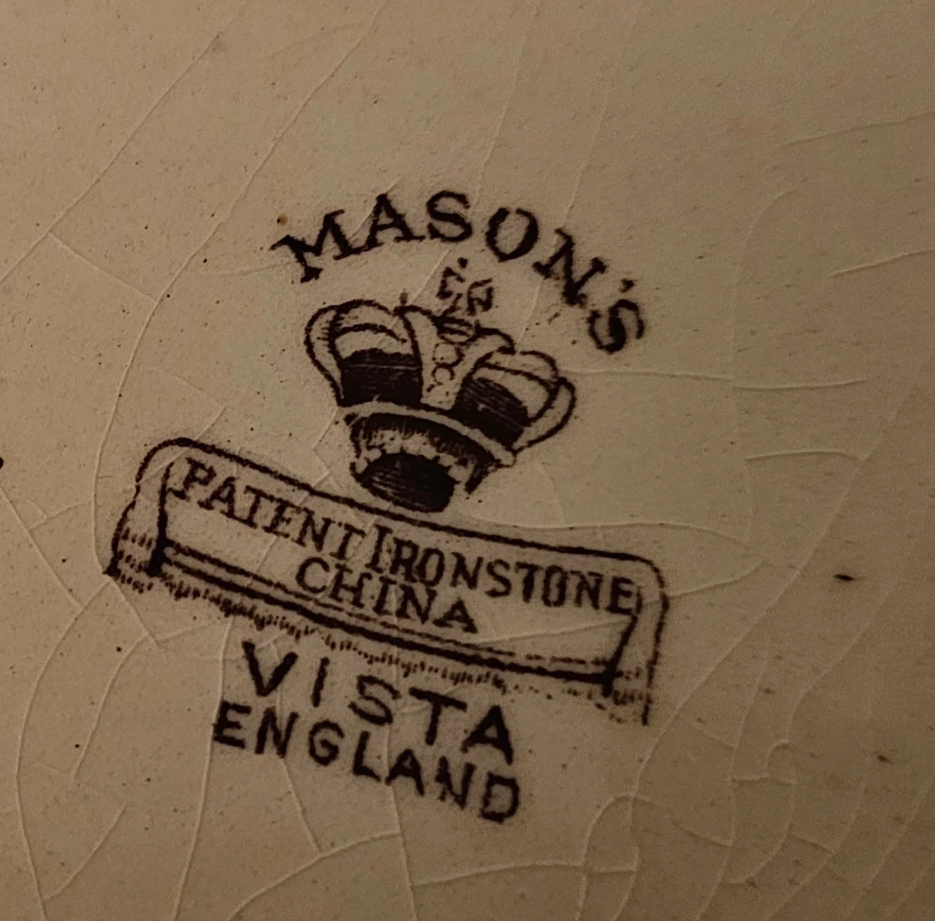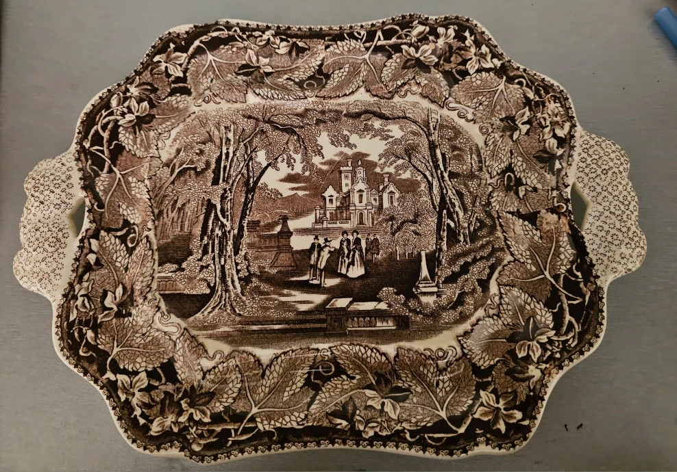 Made of Ironstone China in England with a brown Victorian style design against an ivory background. I've dated this original piece to mid-1800s, but not positive.