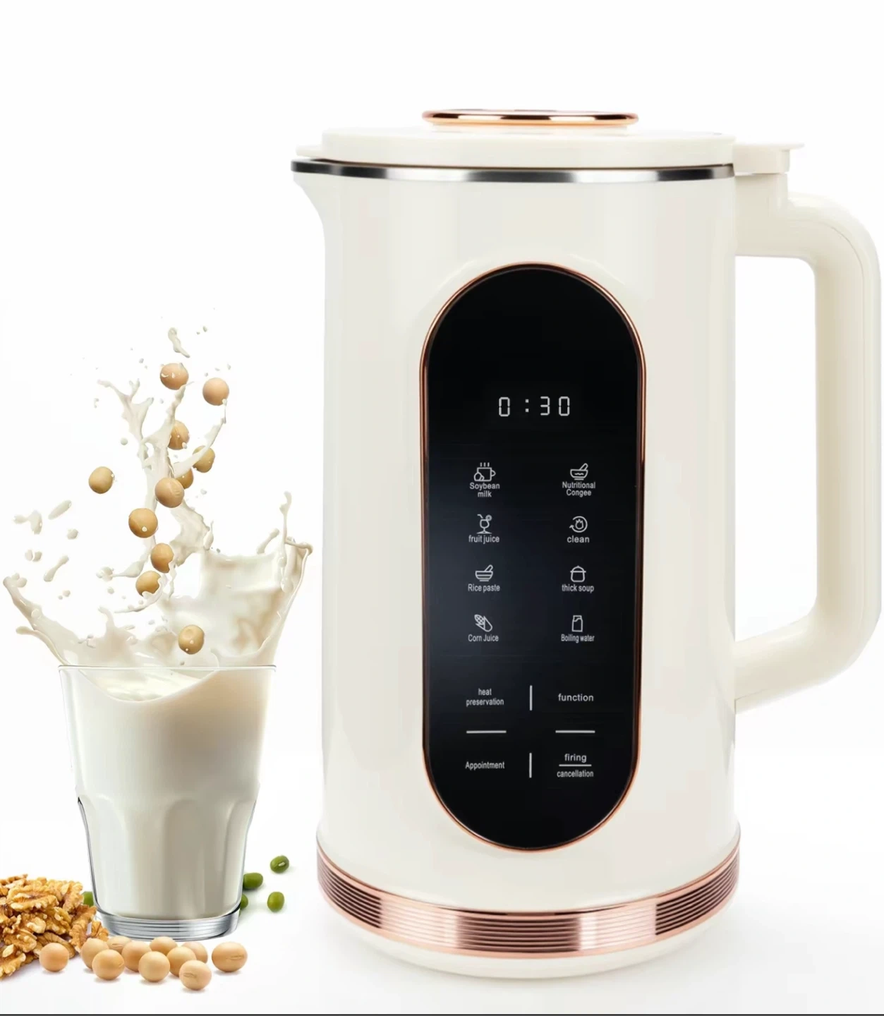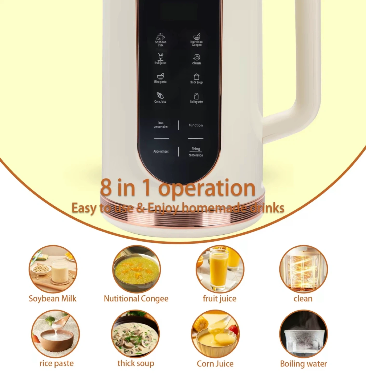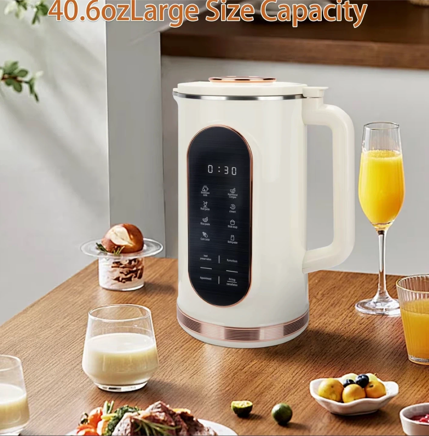 I'm selling a soy milk maker with a large 40.6oz capacity! It has an 8 in 1 operation, making it easy to use and enjoy homemade drinks. You can make soy milk, nutritional congee, fruit juice, rice paste, thick soup, corn juice, and even boil water. It also has a clean function