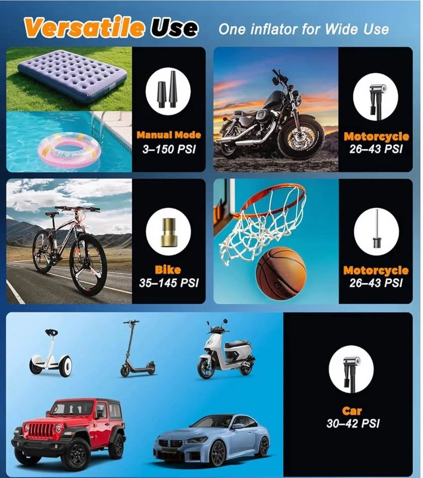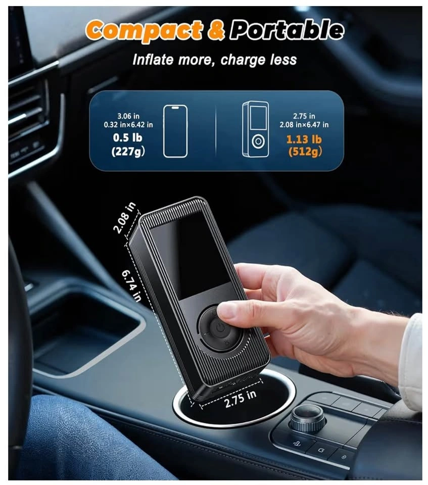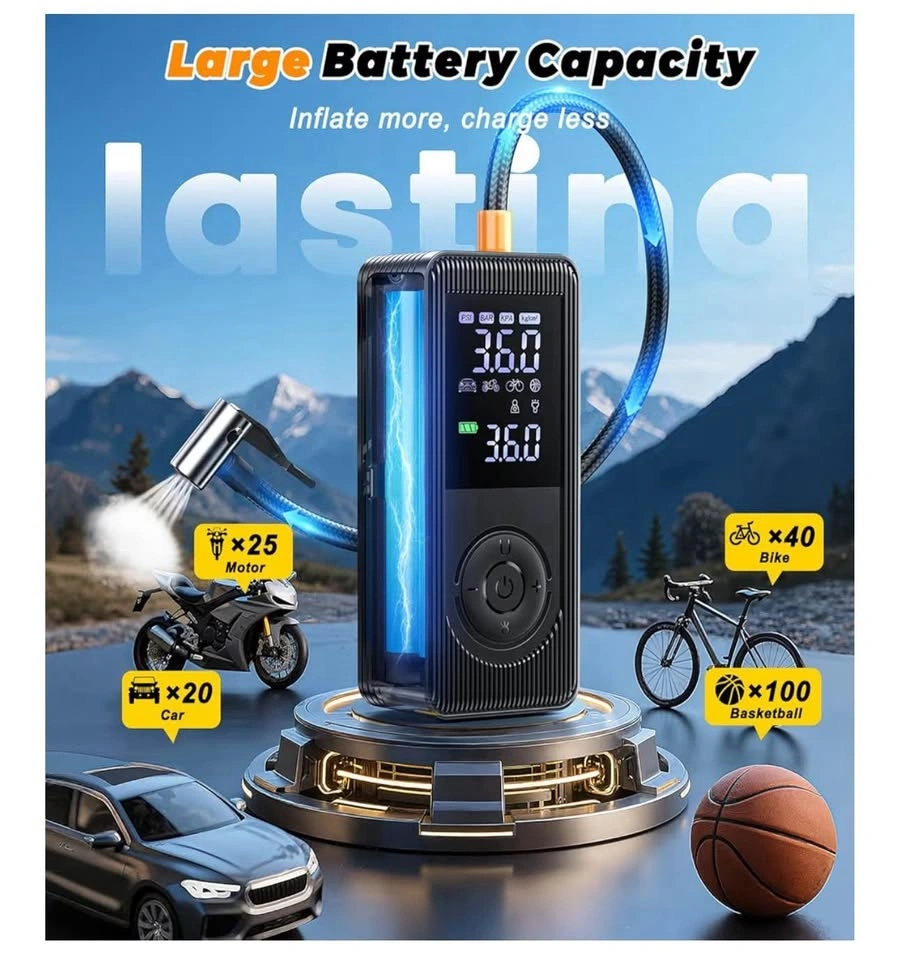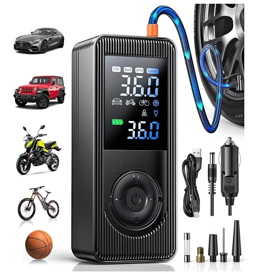 Tire Inflator Portable Air Compressor - 150 PSI Fast Inflation Rechargeable Battery & 12V DC Adapter Powered Air Pump for Car Bike Motorcycle Tires Balls with LCD Display, LED Light, Pressure Gauge
