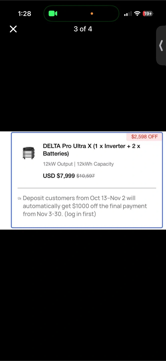 Selling an EcoFlow Delta Pro Ultra X, which includes 1 Inverter and 2 Batteries. It features a 12kW Output and 12kWh Capacity. This unit comes with its original box