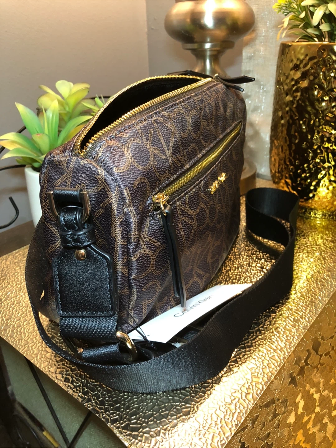 This is a Calvin Klein crossbody bag with a brown patterned design. It features gold-tone zippers and a black adjustable strap. The bag is in great condition and ready for a new owner!