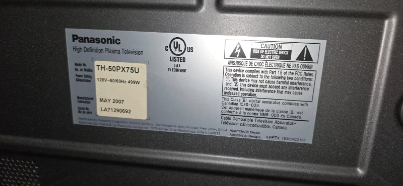 Selling a Panasonic VIERA High Definition Plasma Television. The model number is TH-50PX75U and it's a 50-inch TV. Manufactured in May 2007.