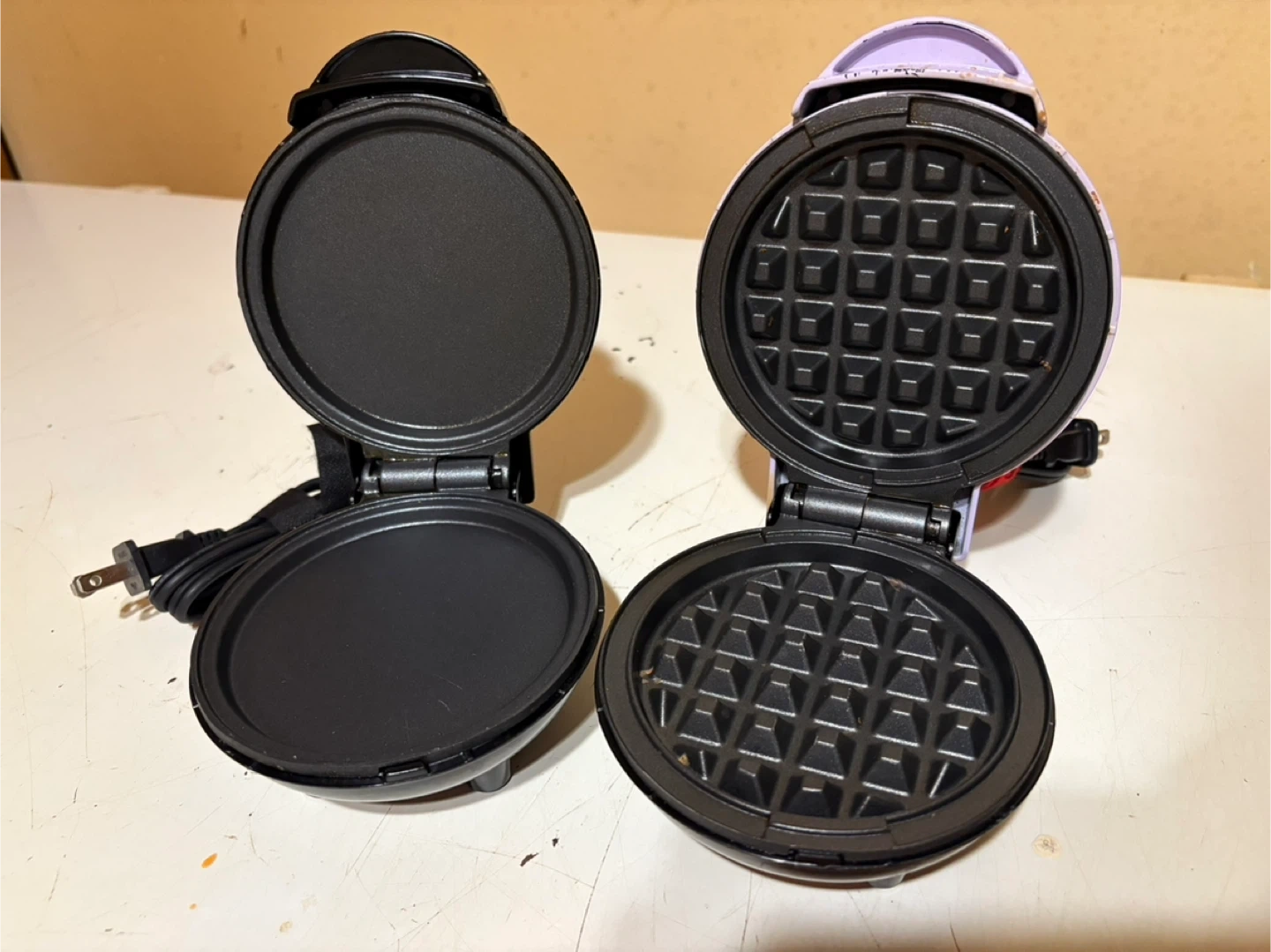 Selling a set of two Dash mini waffle maker and a griddle! One is black and the other is a lovely lavender colour. Perfect for making individual waffles, hashbrowns, or even paninis. They're super easy to use and clean, and they heat up quickly. Great for small kitchens or dorm rooms!