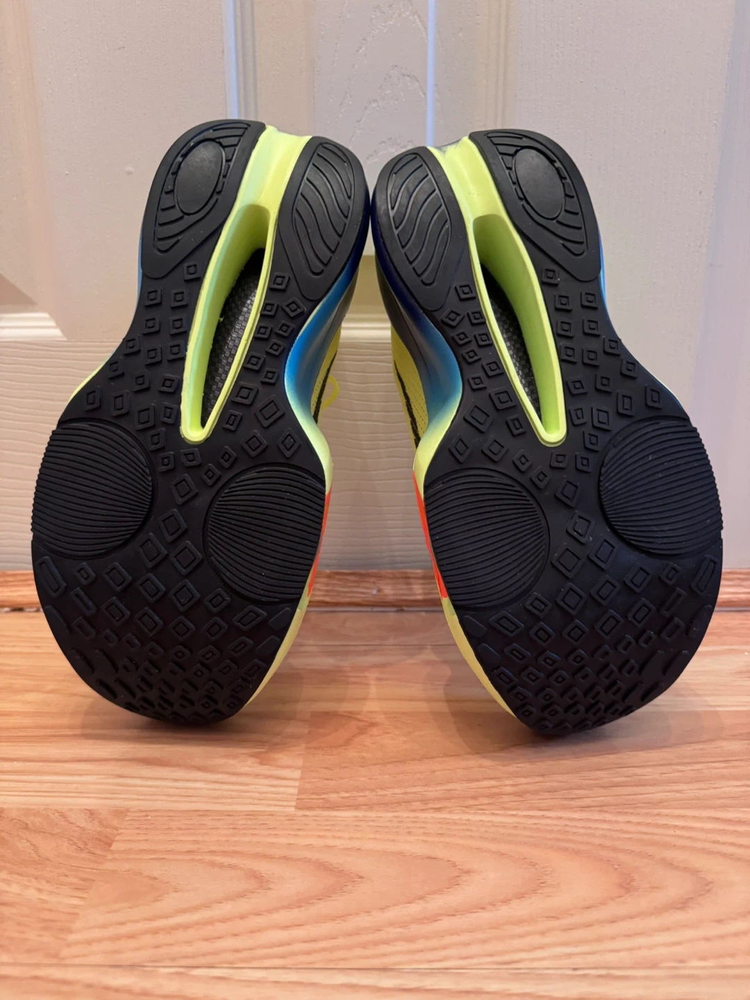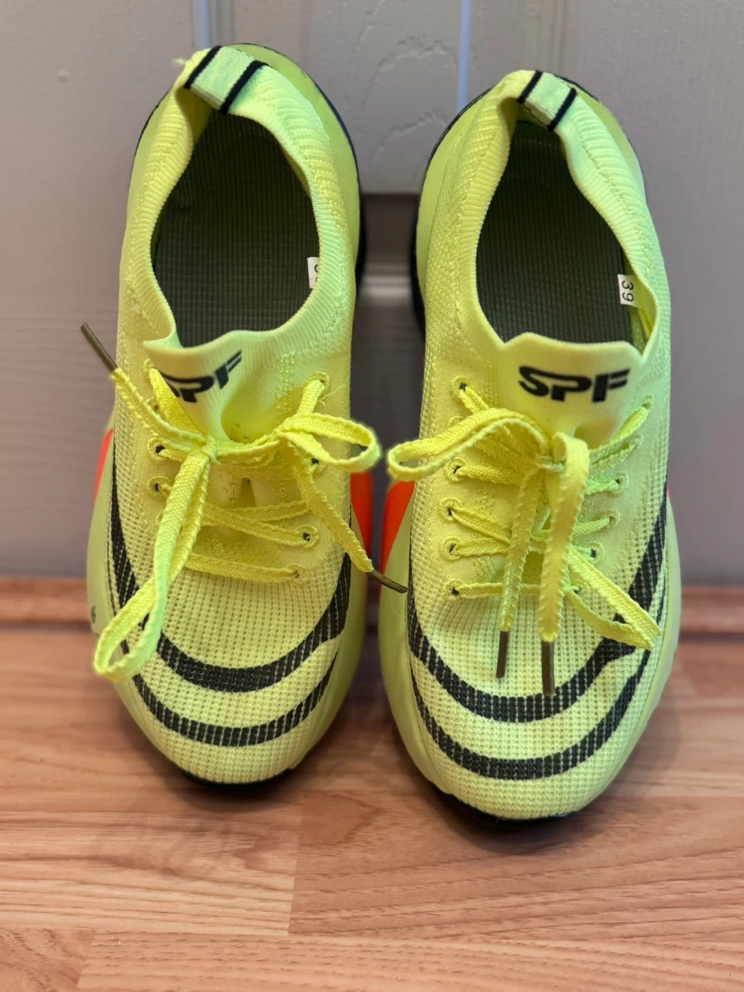 Selling a pair of Nike ZoomX Vaporfly NEXT% 2 running shoes in a vibrant yellow color! These shoes are designed for speed and performance, featuring Nike's innovative ZoomX foam for a responsive and cushioned ride. They show some signs of use but are still in good condition for your next run or workout.
