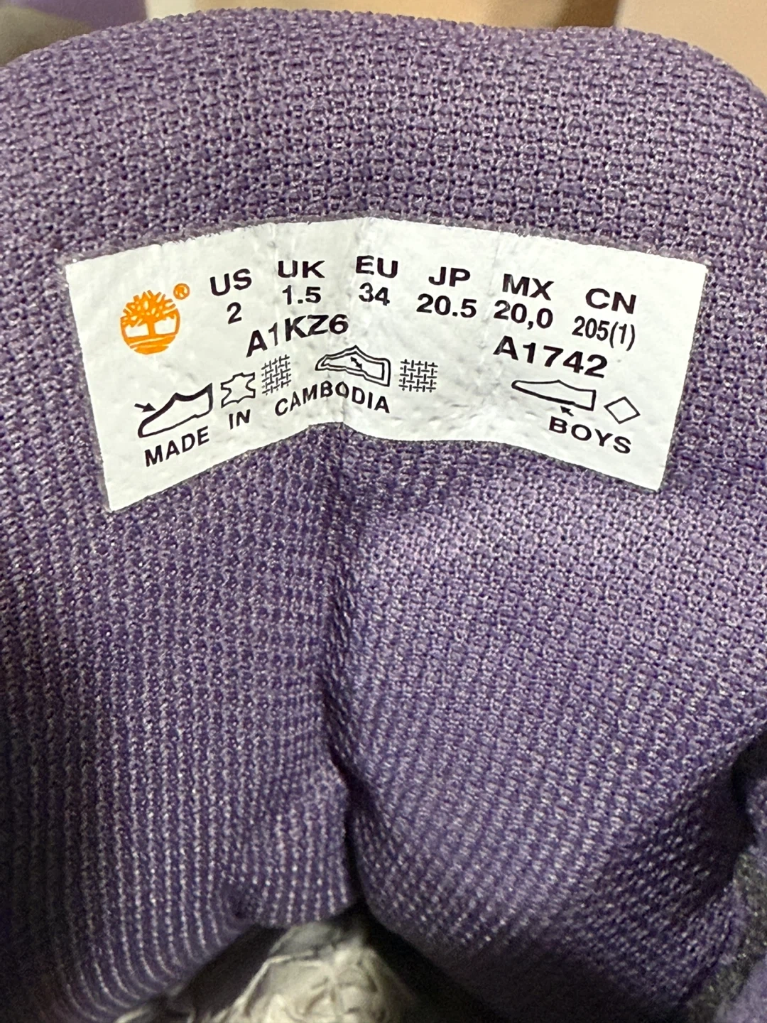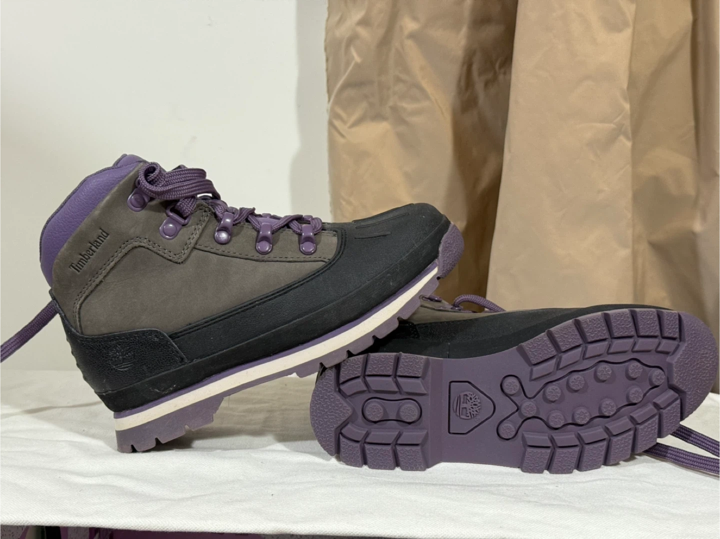 Selling a pair of Timberland Euro Hiker boots in a stylish gray and purple colorway! These boots are a US size 2 and feature the classic Timberland logo. Perfect for outdoor adventures or everyday wear