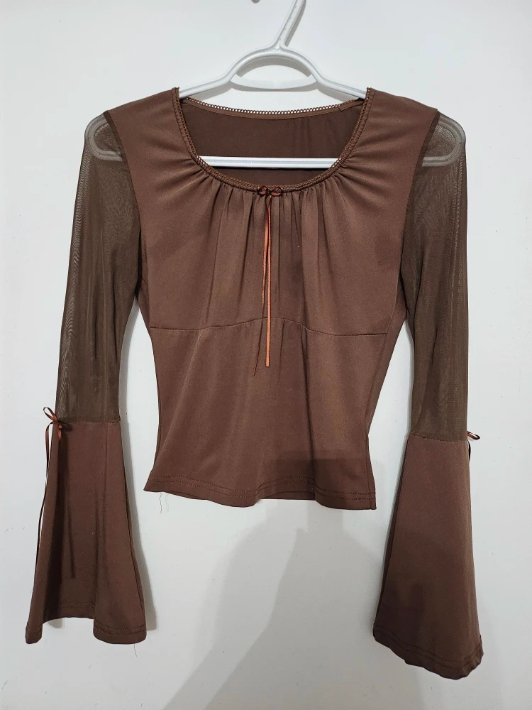 💫Here's a cute brown long sleeve top! It has a unique design with mesh sleeves and flared cuffs. Perfect for adding a touch of style to your wardrobe💫