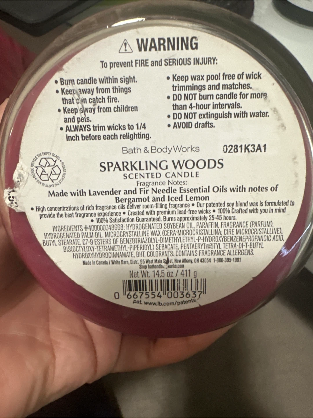Selling a Bath & Body Works Sparkling Woods scented candle! It's made with lavender and fir needle essential oils, with notes of bergamot and iced lemon. Net weight is 14.5 oz / 411 g