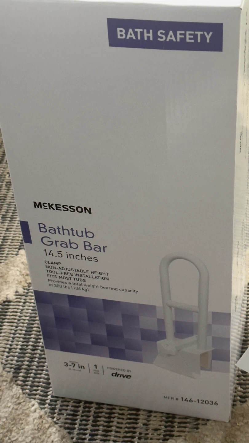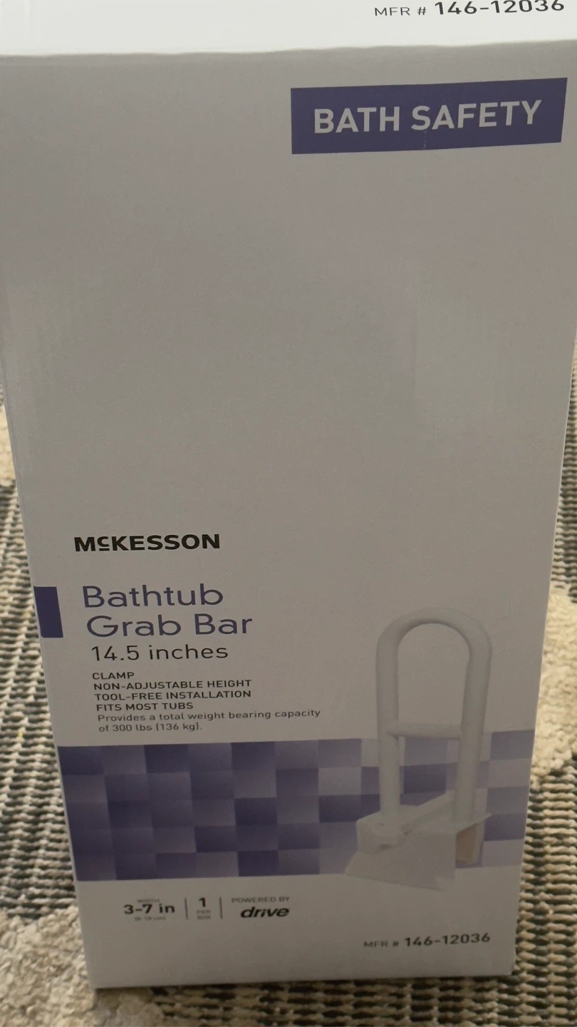 Selling a brand new McKesson Bathtub Grab Bar, still in its original box! This grab bar is 14.5 inches and features a clamp with adjustable height for tool-free installation on most tubs. It provides a total weight bearing capacity of 300 lbs (136 kg).