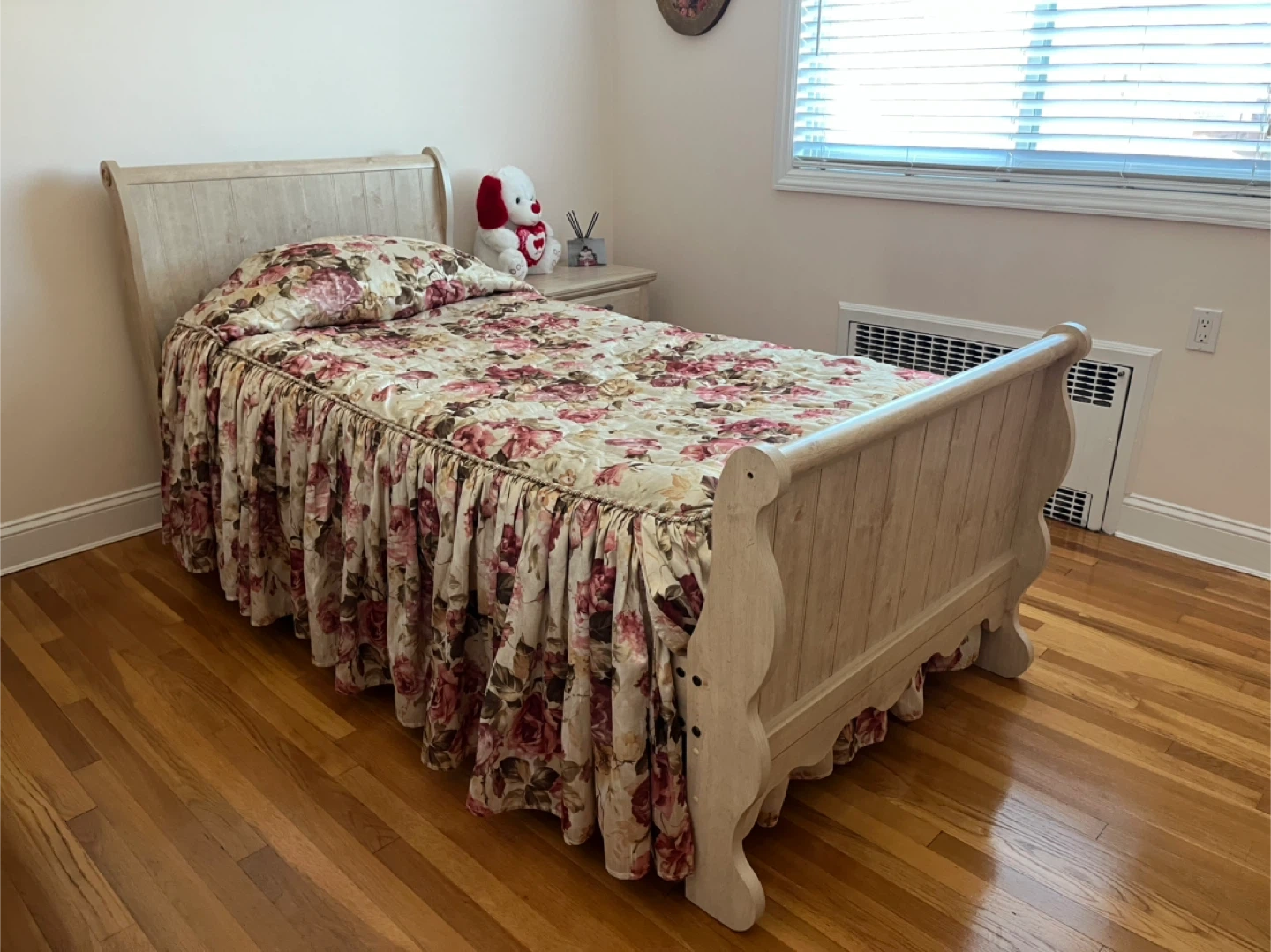Selling a bed frame with floral bedding. The frame is made of wood and has a light finish. The floral bedding includes a comforter and pillowcase, featuring a rose pattern in shades of red, pink, and cream. It gives a warm and inviting look to any bedroom