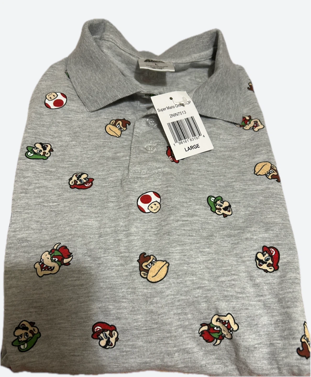 This is a Super Mario themed golf shirt. It's a light gray color with an all-over print (AOP) featuring classic Super Mario characters and items. The shirt is a size large and made of 60% cotton and 40% polyester