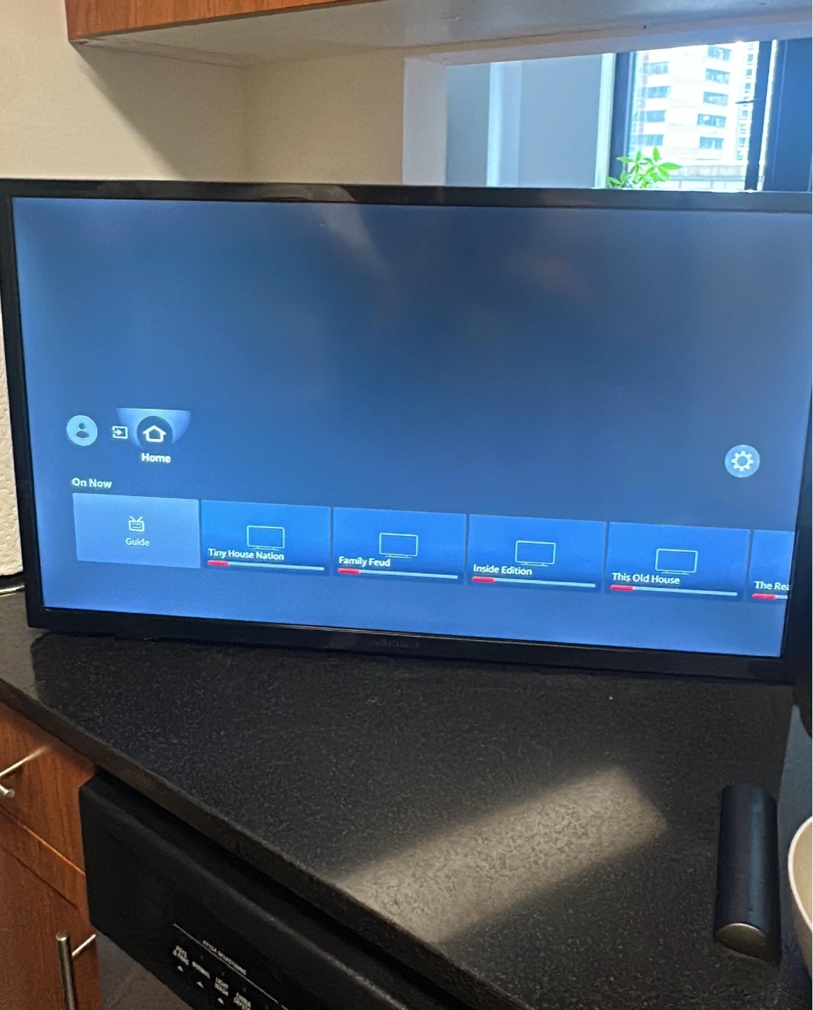 El televisor es un Insignia NS-32F201NA23, un Smart TV LED de 32 pulgadas con Fire TV integrado y resolución Full HD 1080p. Incluye funciones inteligentes como acceso a apps, control compatible con Alexa y puertos HDMI y USB. Funciona con alimentación de 120V y es un modelo compacto, ideal para cocinas, cuartos o espacios pequeños!!
