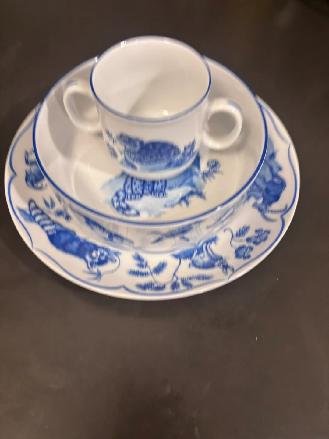 Selling a set of Chase Shangri-La dishes! This set includes a cup, bowl, and plate, all featuring a beautiful blue and white design with various wild animals. The dishes are made in the Czech Republic. They are perfect for adding a touch of elegance to your table setting!