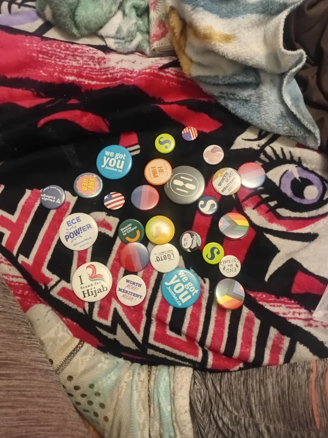 Here's a collection of various buttons and pins. They include different designs and messages, such as 'We got you .humber.ca', 'SHE/HER pronouns', 'HE/HIM pronouns', 'ECE POWER', 'I Stand for Hijab', 'WORTH MORE! MÉRITENT MIEUX!', and 'LGBTQ+'. There are also some with the letter 'S' and flag designs