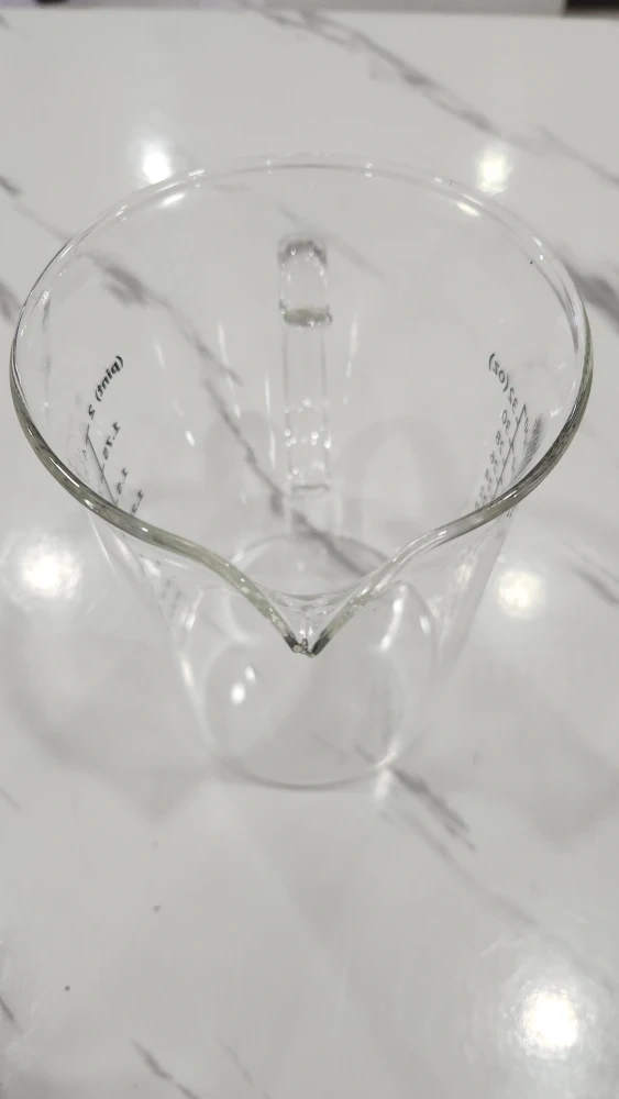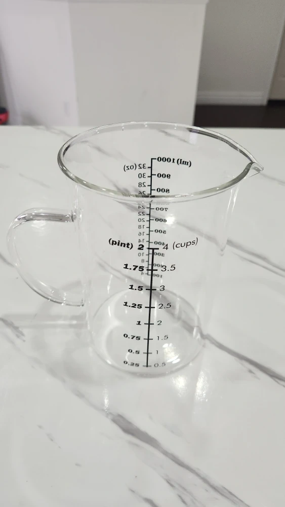 A large pitcher type measuring cup. Has 4 types of measurements which are cups, pints, ml, and oz in black writing instead of red. Making the measurements a bit easier to read.