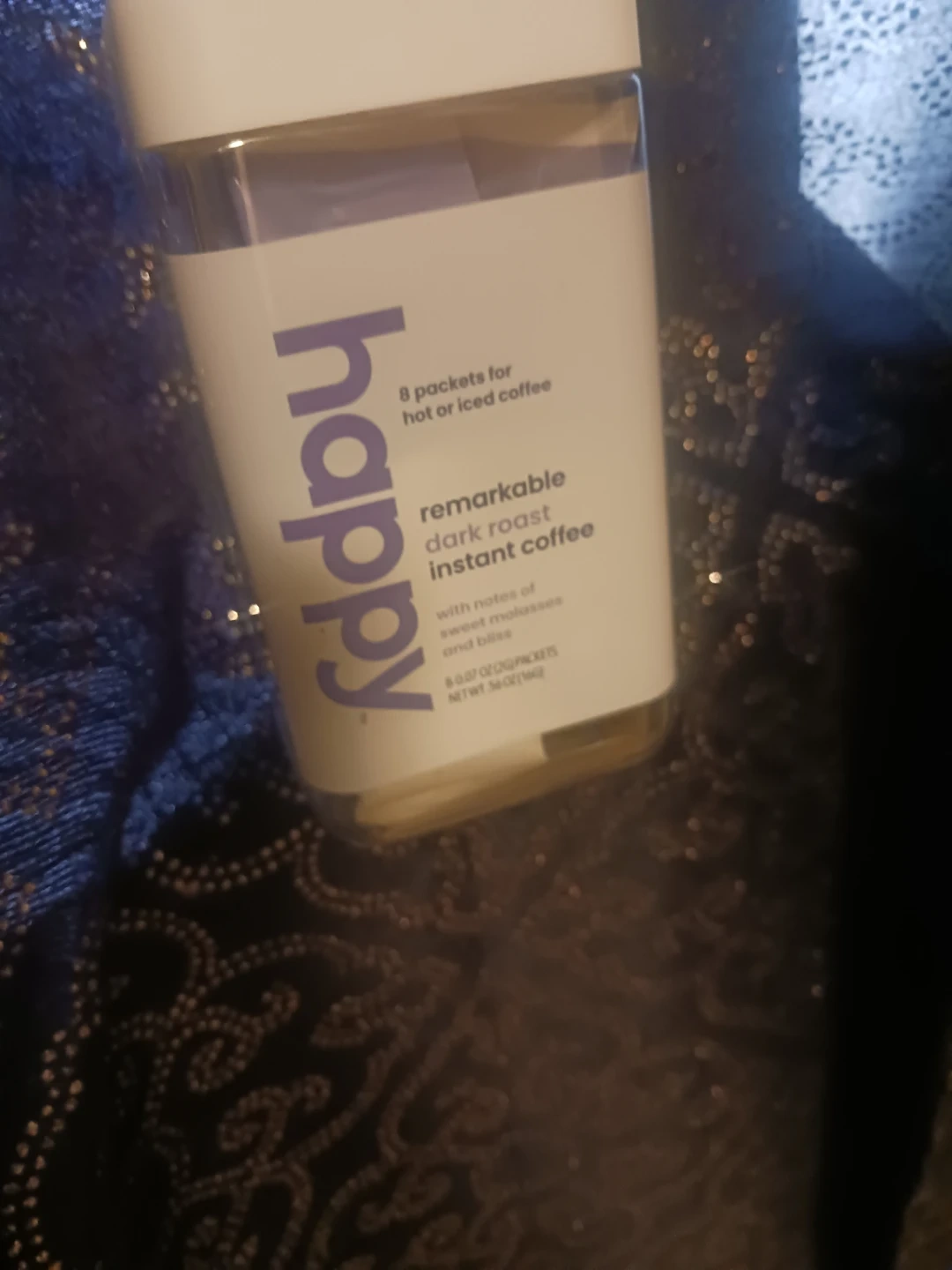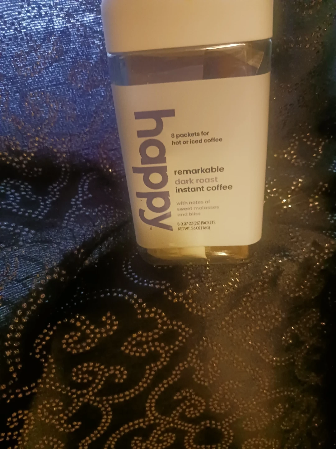 Selling a container of Happy Remarkable Dark Roast Instant Coffee. It contains 8 packets for hot or iced coffee. The coffee has notes of sweet molasses and bliss. Net weight is 5.6 oz (160g).