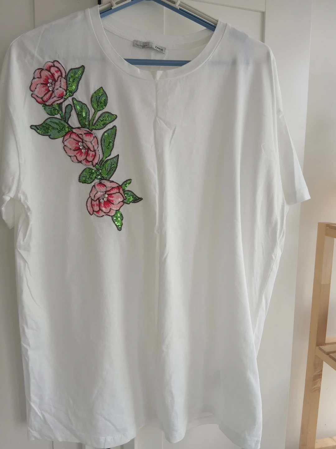 Selling a Zara white T-shirt with beautiful floral appliqué detailing! It's a size large and in great condition. Perfect for adding a touch of elegance to your casual wear