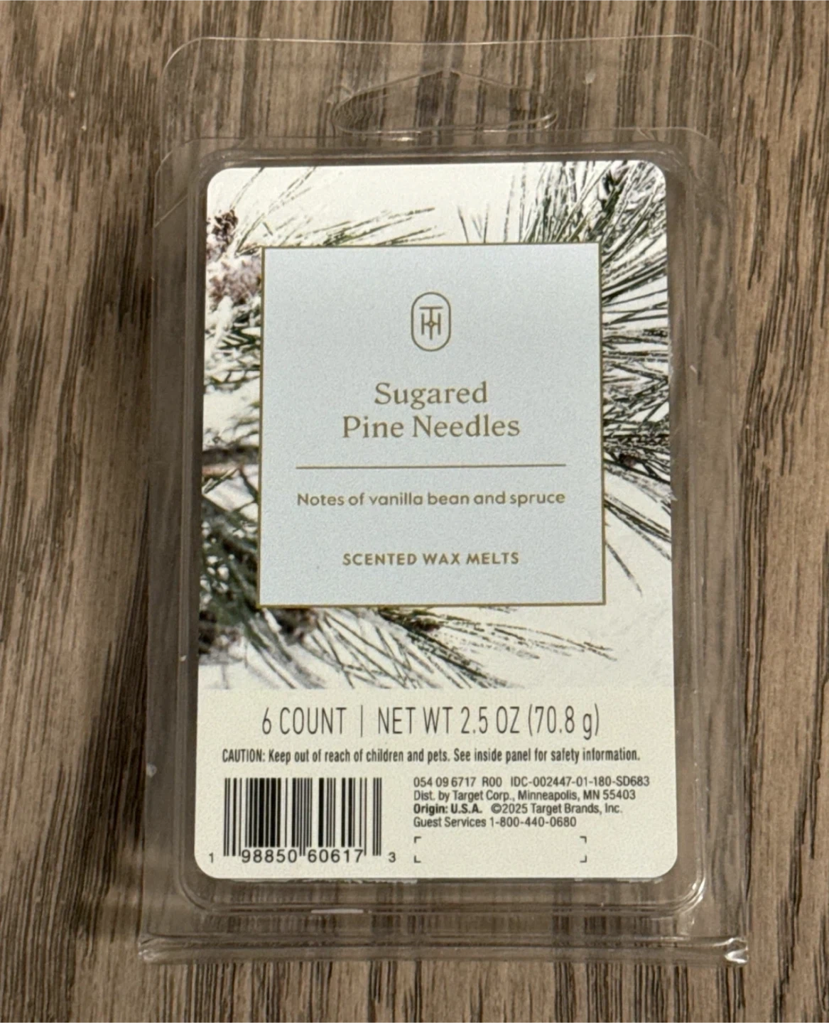 Selling a pack of Threshold Sugared Pine Needles scented wax melts! It includes 6 wax melts with notes of vanilla bean and spruce. Net weight is 2.5 oz (70.8 g). Great for customizing your fragrance and filling your space with a pleasant aroma