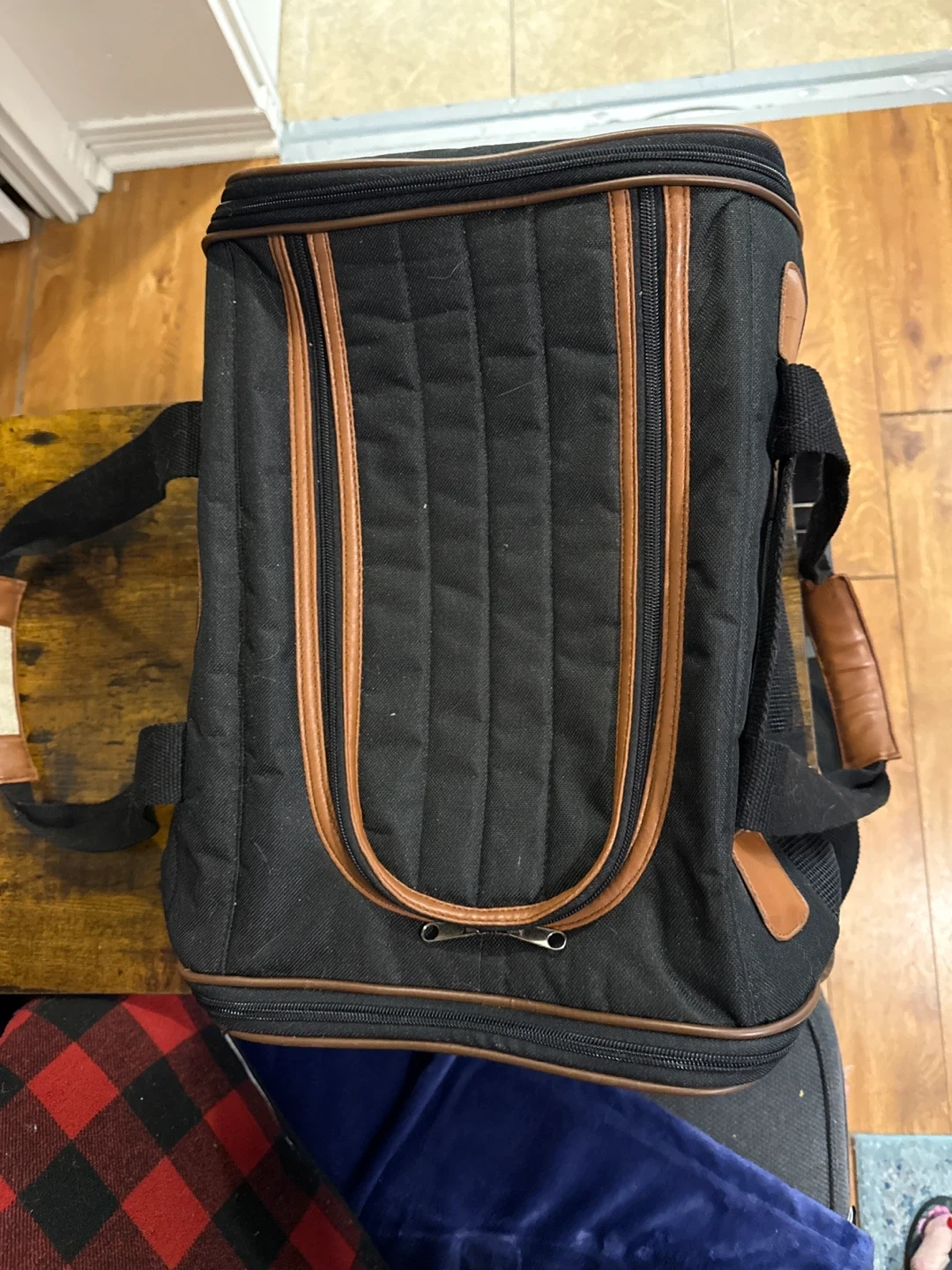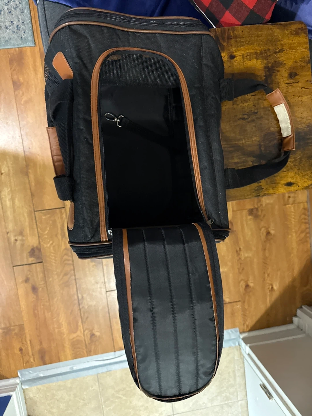 This is a black pet carrier with brown accents. It has mesh sides for ventilation and a comfortable handle for carrying your furry friend. It's in great condition and ready for its next adventure!