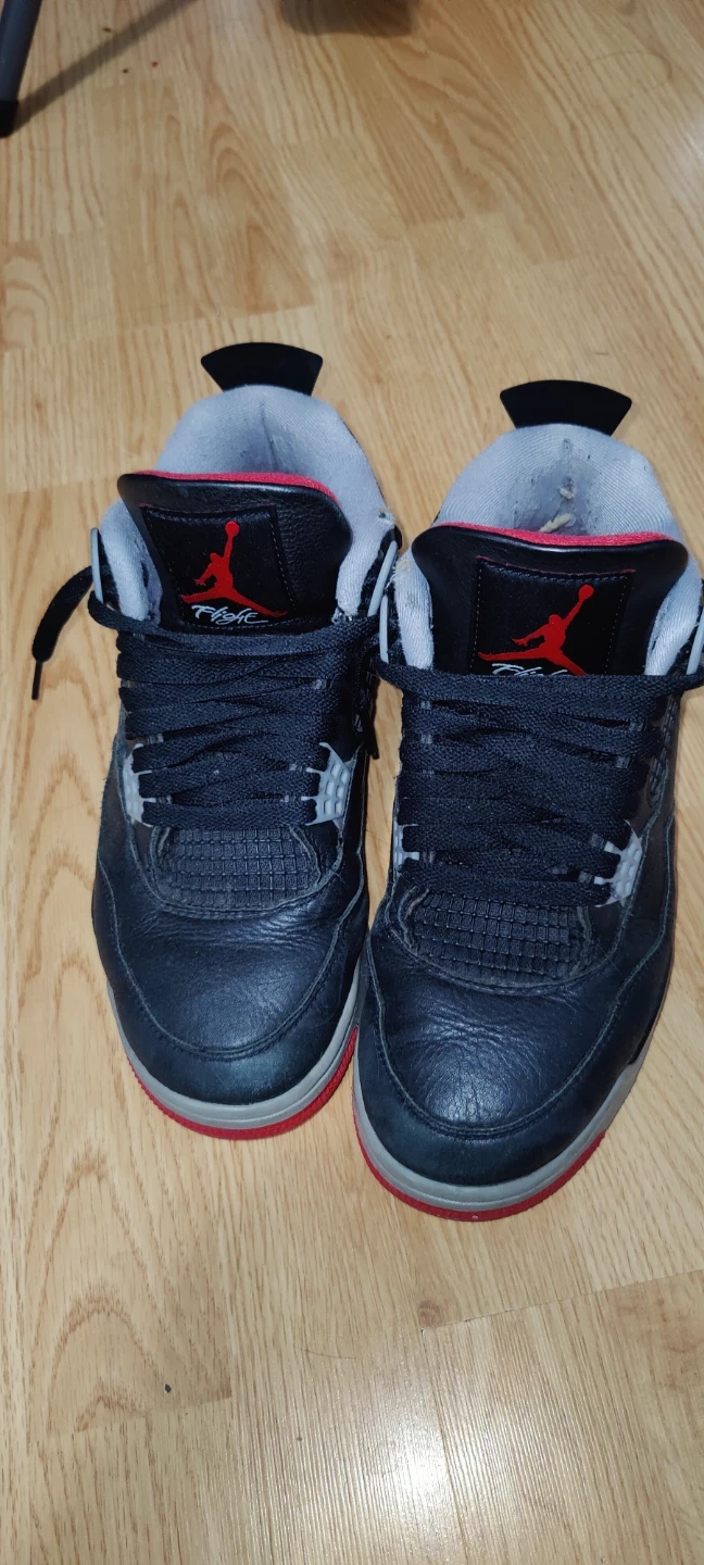 Selling a pair of Nike Air Jordan 4 Retro sneakers in black and red. They show signs of wear, as seen in the photos, but still have plenty of life left!