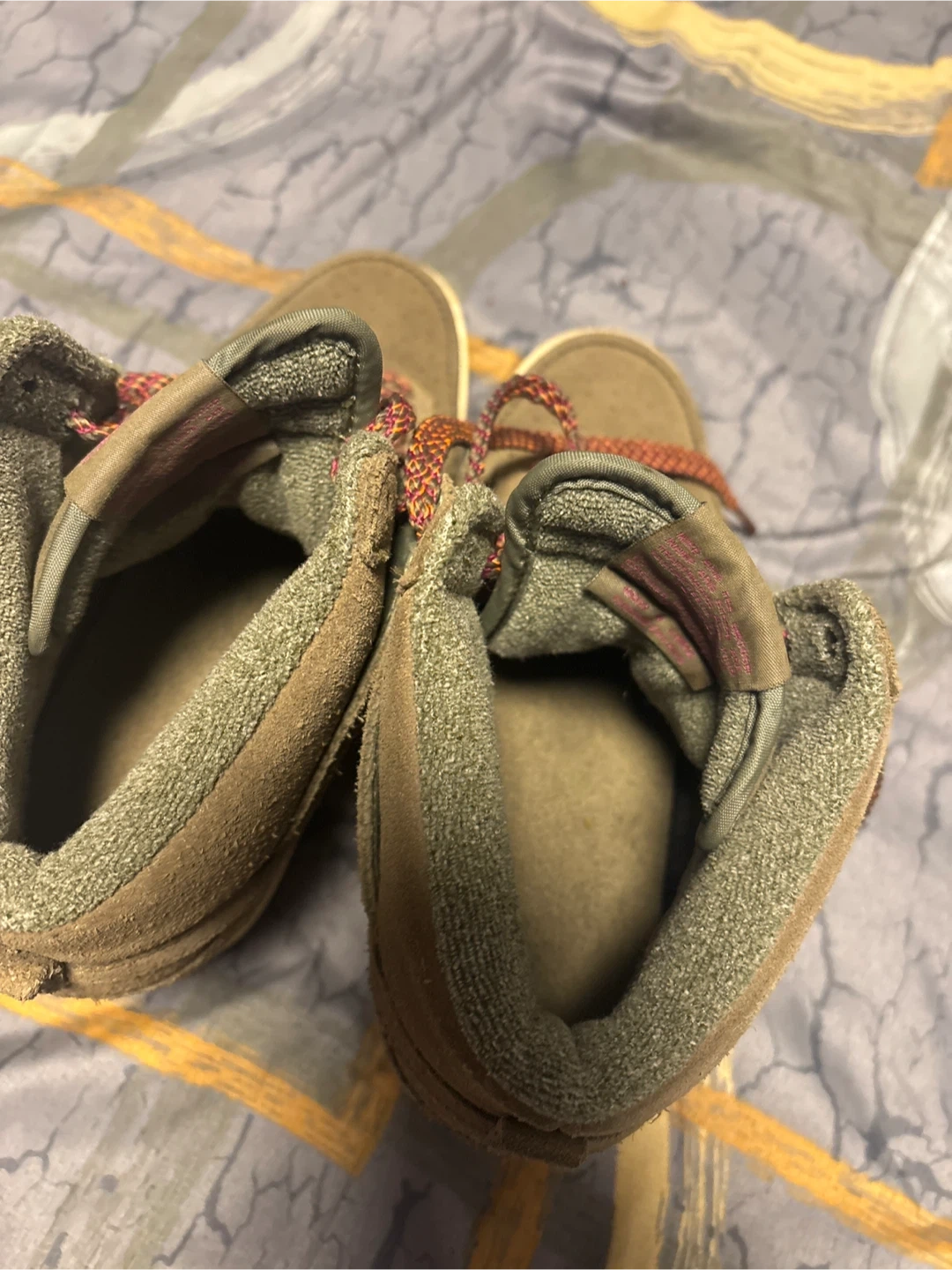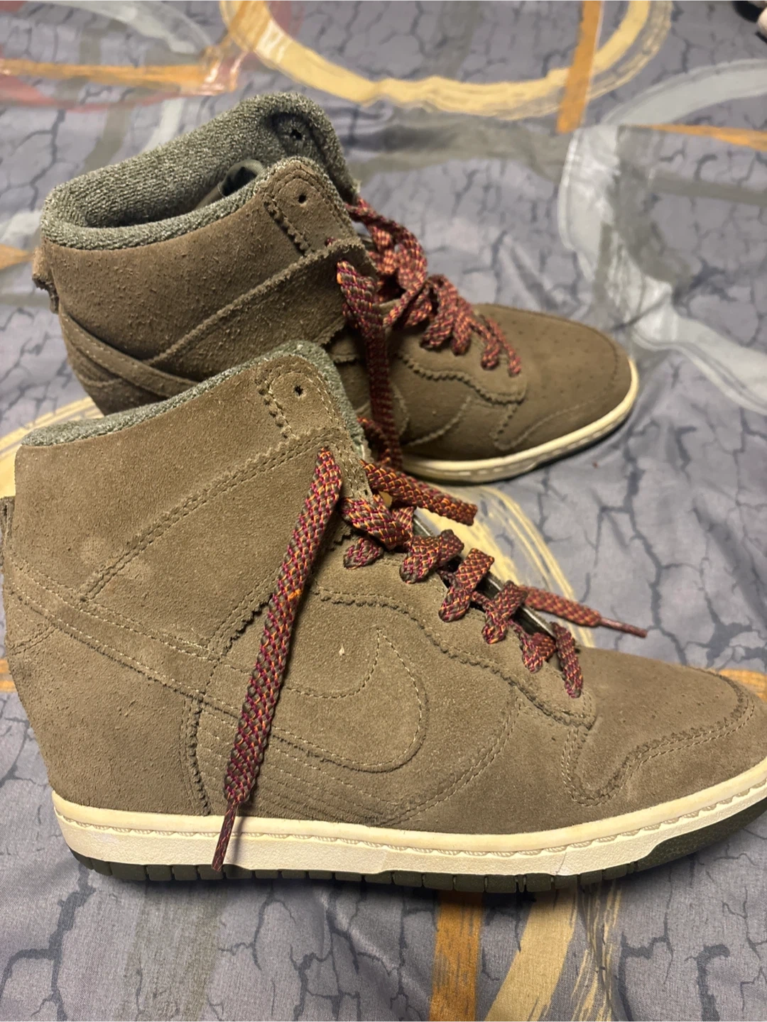 Selling a pair of Nike Dunk Sky High women's sneakers. They are a stylish high-top design in a neutral brown color with red and brown patterned laces. The shoes are in good condition and ready for a new owner!