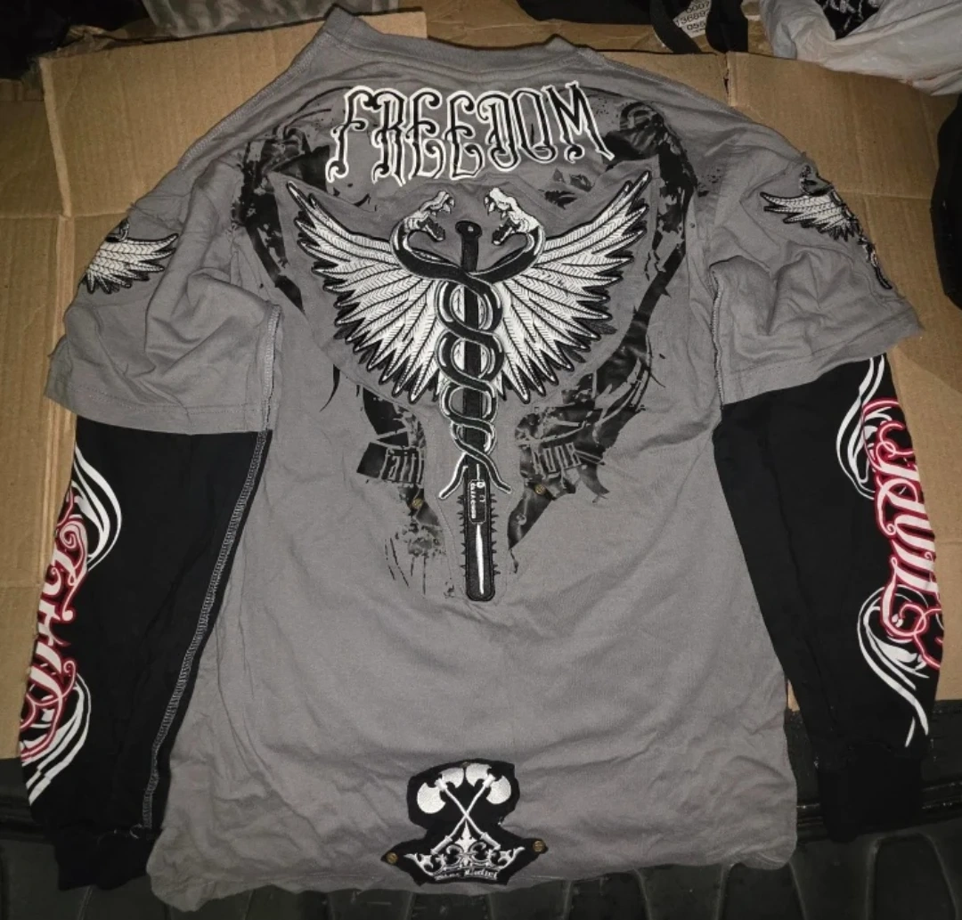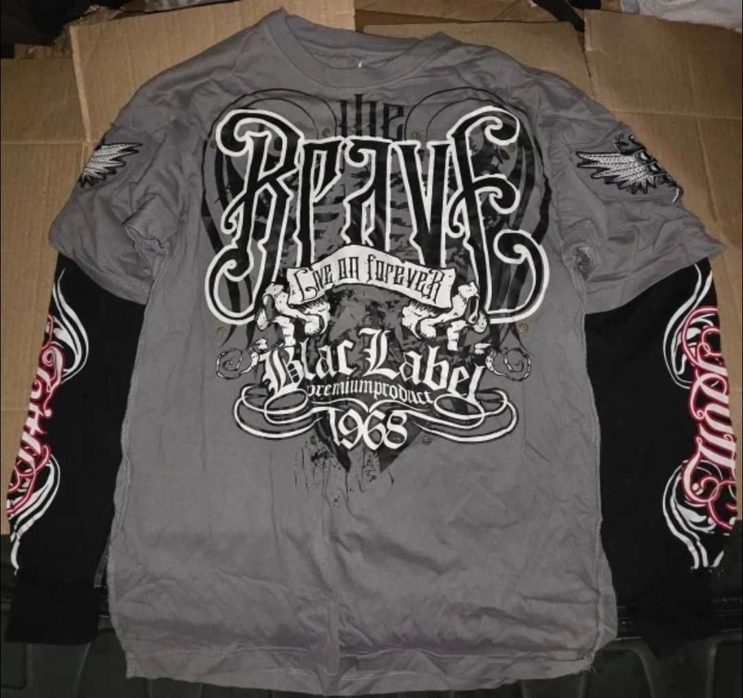 Selling a gray and black long-sleeve shirt with a layered look. The shirt features a graphic design with the words "The Brave" and "Blac Label Premium Product 1968" on the front. The sleeves also have a unique design. The back of the shirt has a "Freedom" graphic as well