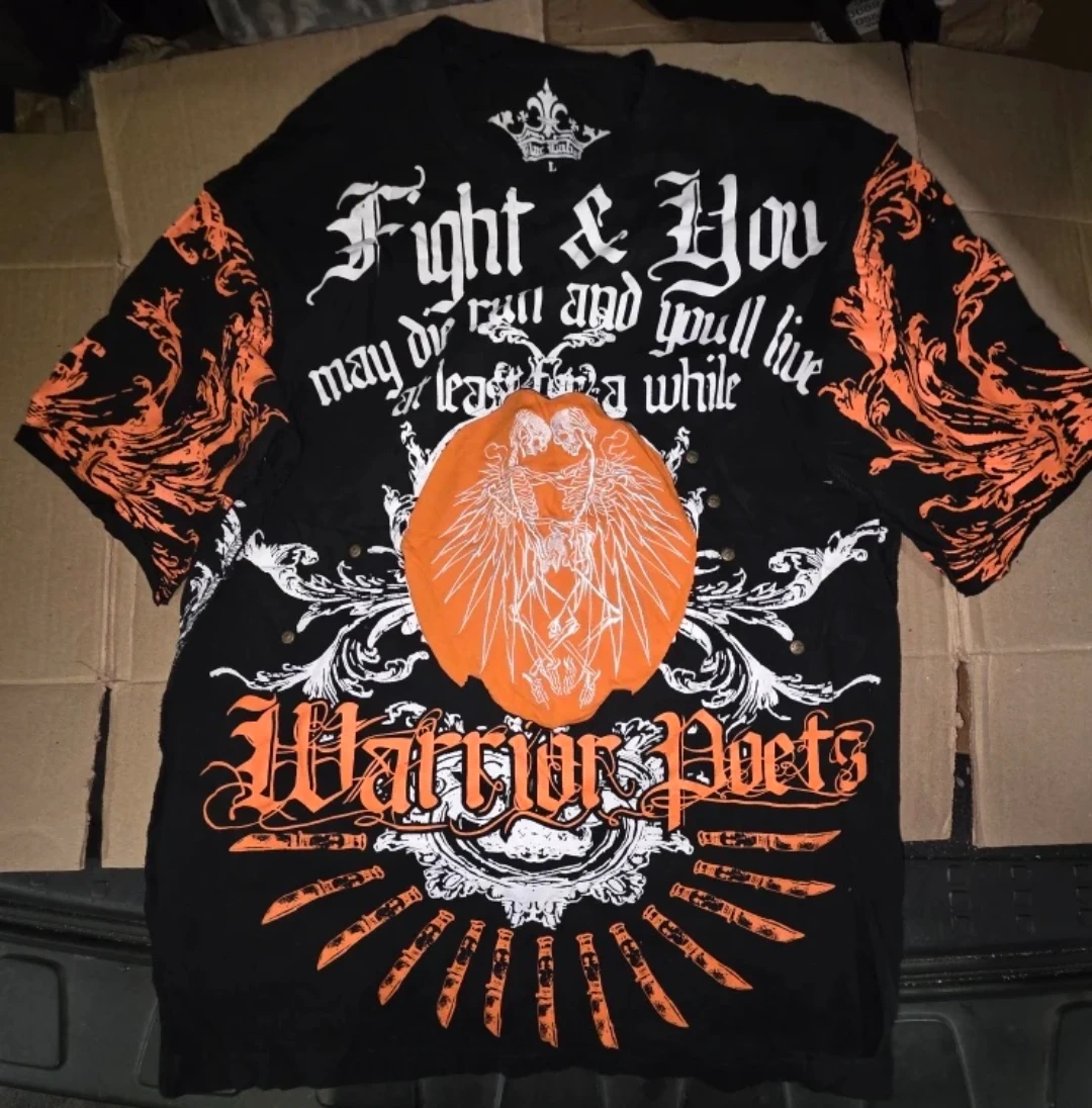 Cool graphic tee with a bold design! It features a striking "Fight & You" and "Warrior Poets" print on the front, with additional graphics on the sleeves and back. The shirt is black with orange and white accents. Size L.