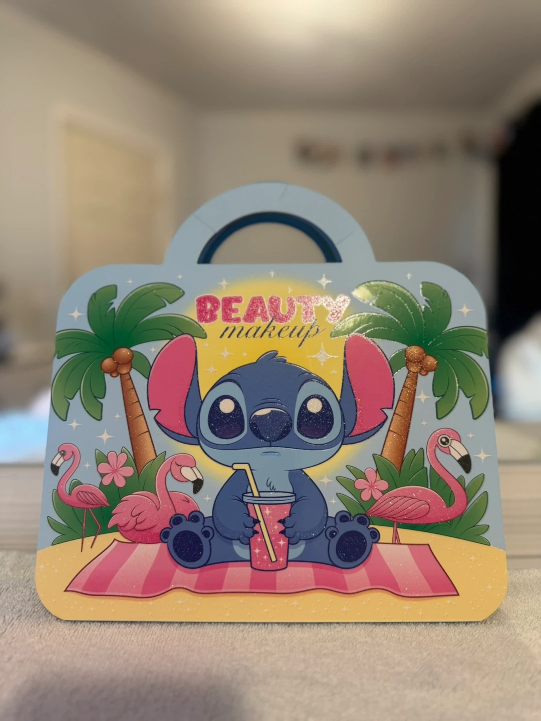 I'm selling a super cute Disney Stitch beauty makeup kit! It comes in a carrying case with a handle. There are two different designs, one pink with strawberries and one blue with palm trees and flamingos. Perfect for any Stitch fan!