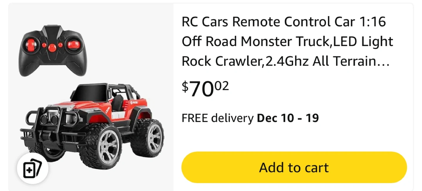 I'm selling a RC Cars Remote Control Car. It is a 1:16 scale off-road monster truck with LED lights. It's a rock crawler with 2.4Ghz all-terrain capabilities. Originally bought for $70.02