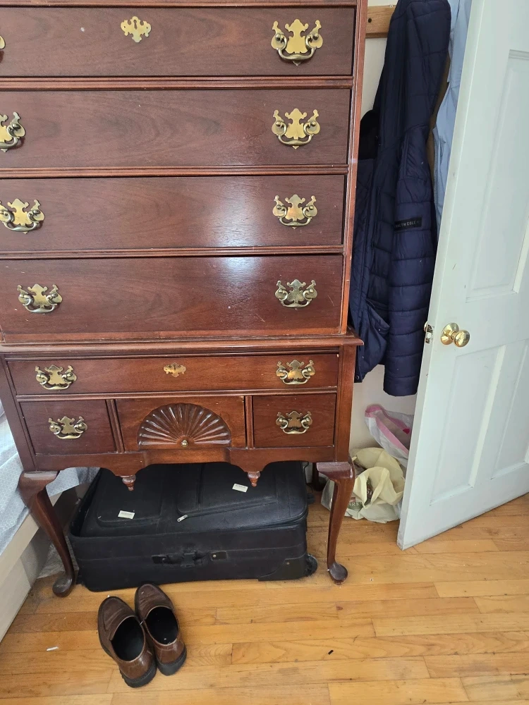 Here's a lovely wooden chest of drawers with an antique style! It features multiple drawers and decorative brass-colored handles. The wood has a rich, warm tone that would complement many rooms.