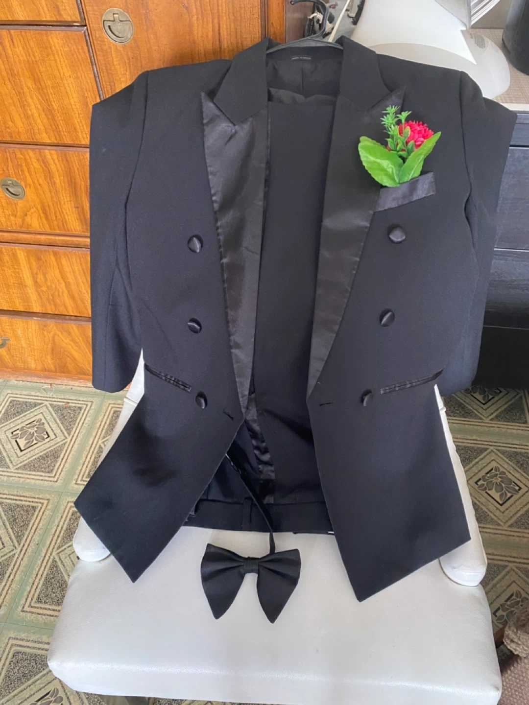 Selling a classic black tuxedo suit, perfect for formal events! Includes the jacket, pants, and a matching bowtie. The suit is in great condition and ready to wear.Only worn once