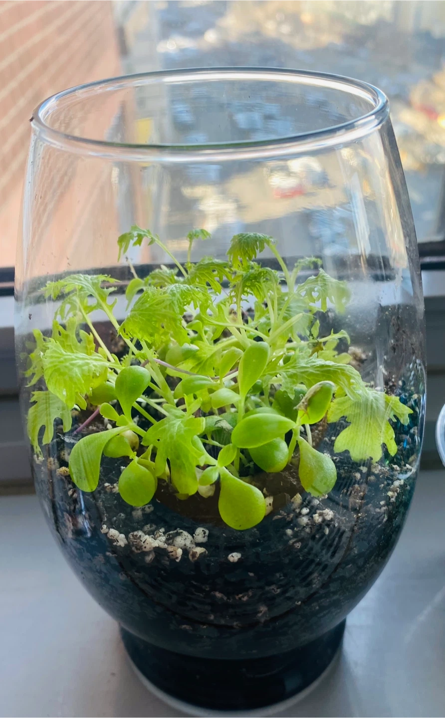 Selling a small potted plant in a clear glass vase! It measures approximately 6 inches wide and 8 inches tall. It's a cute little addition to any room