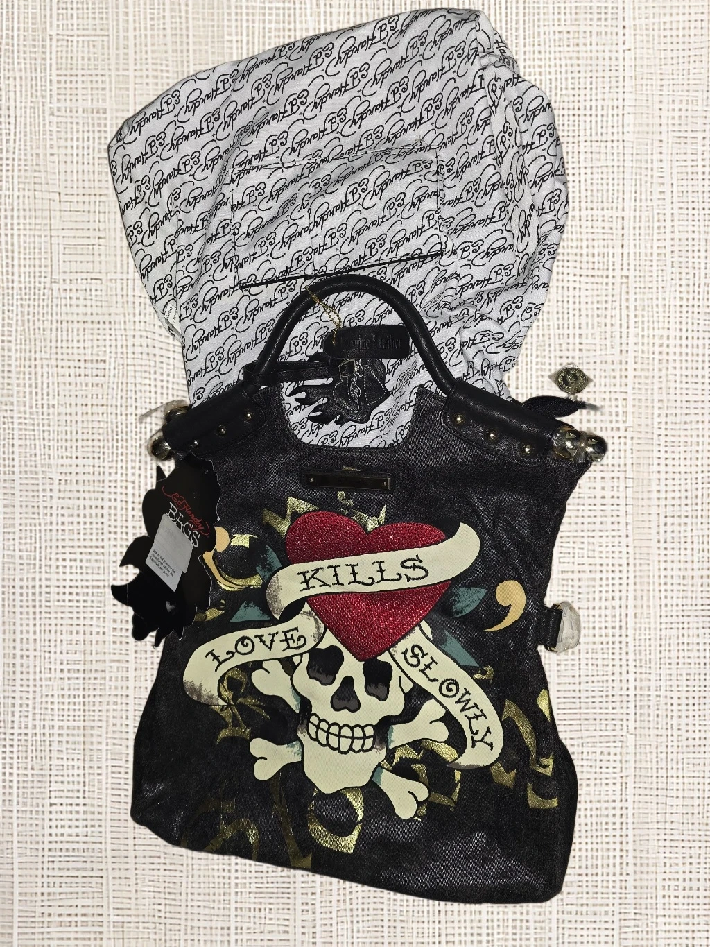 Ed Hardy tote bag with unique designs! This bag is in great condition and ready for a new owner. It features a cool design with roses and a skull. Perfect for anyone who loves a standout accessory!