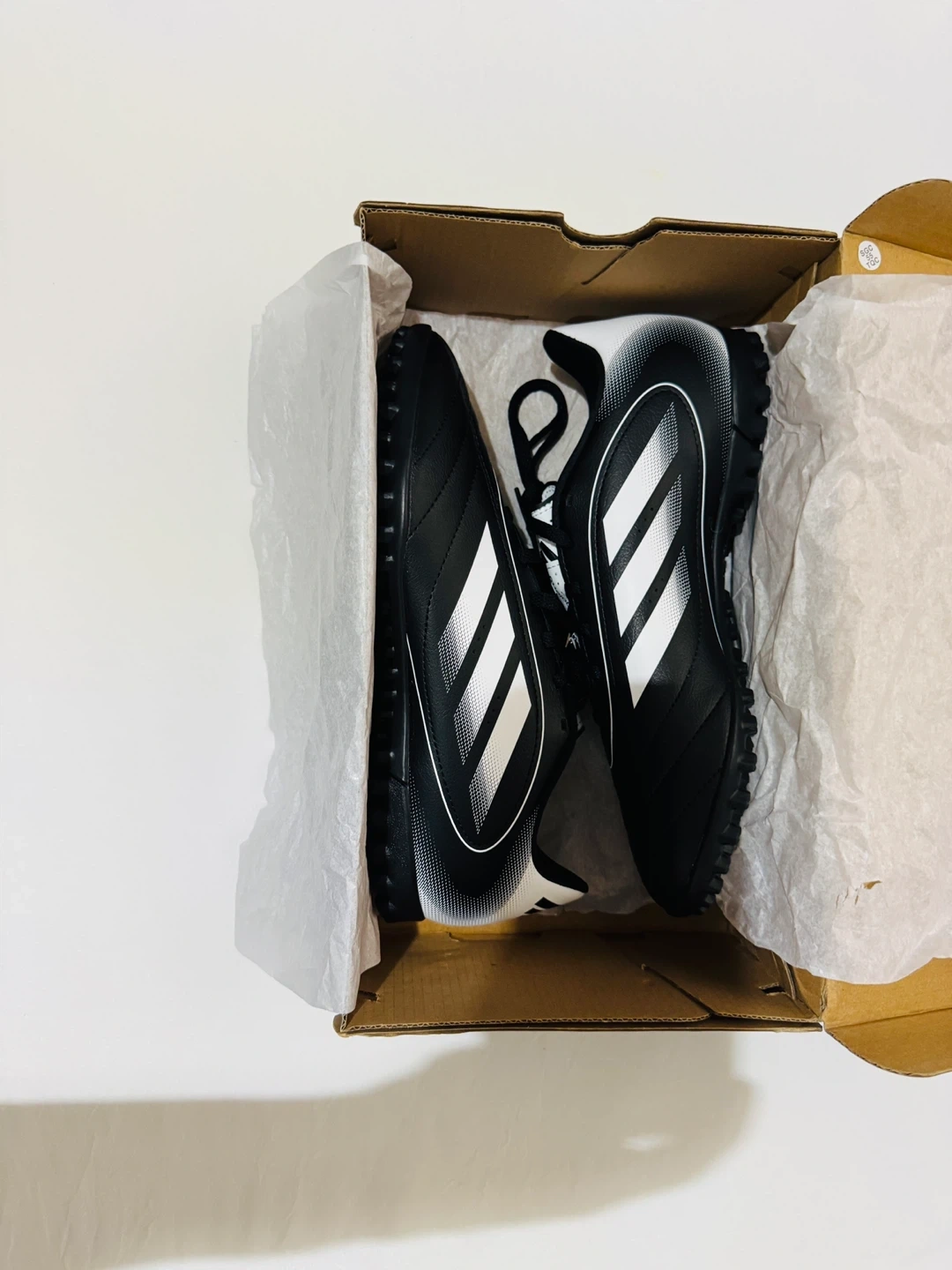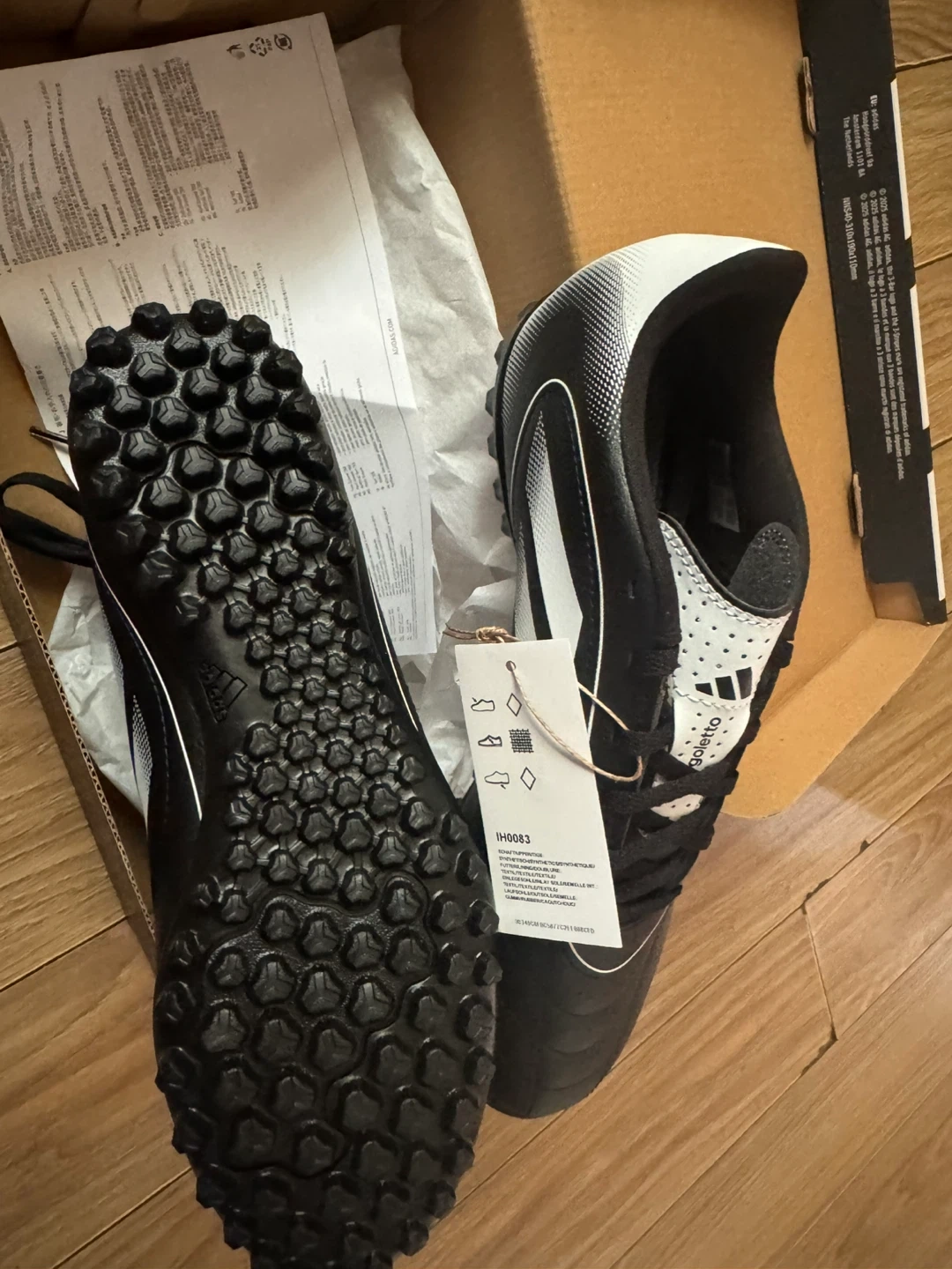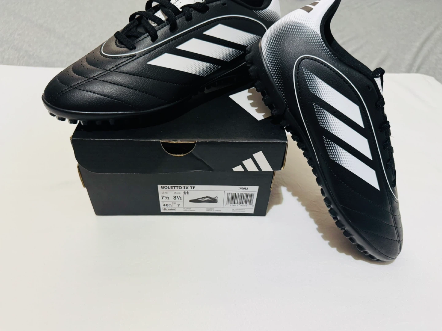 I'm selling a pair of brand new Adidas Goletto IX TF soccer shoes! They are black with white stripes, and the size is 7.5. For men, and 8.5 for women unisex stile. They come with the original box