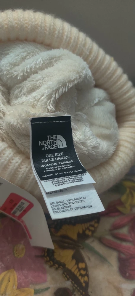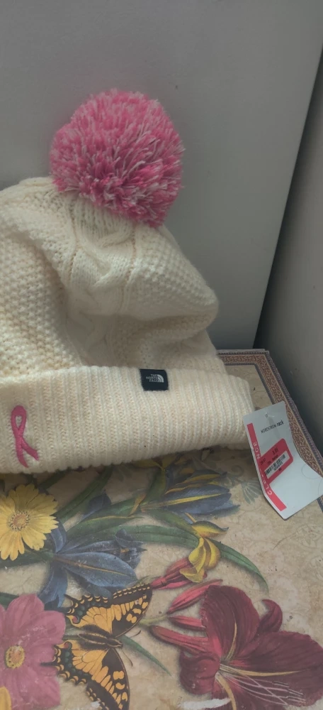 Selling a cream-coloured The North Face beanie. It's a one-size-fits-all and features a cute pink ribbon detail. This hat can be worn by youth -adults